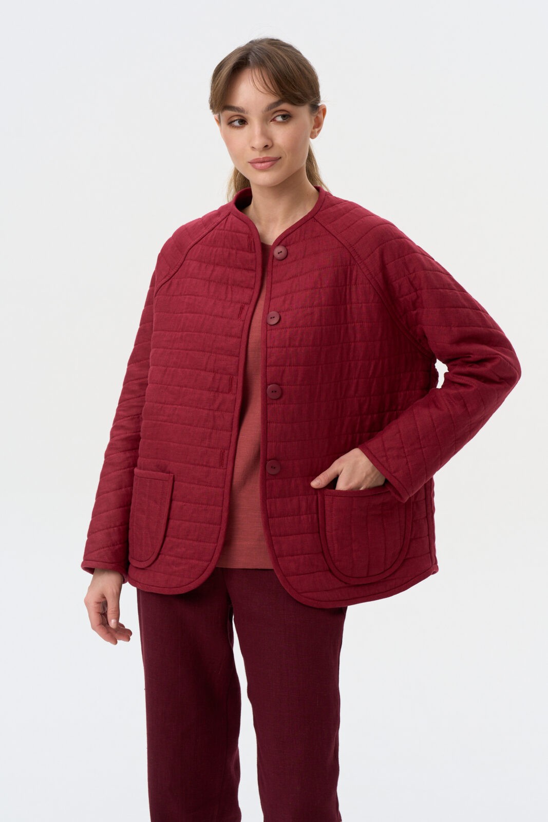 Жакет утепленный стеганный на футере среднего объема длиной до середины бедра. Спинка с цельнокроеным рукавом. Застежка центральная на пуговицы. Горловина округлой формы. Спереди накладные карманы.