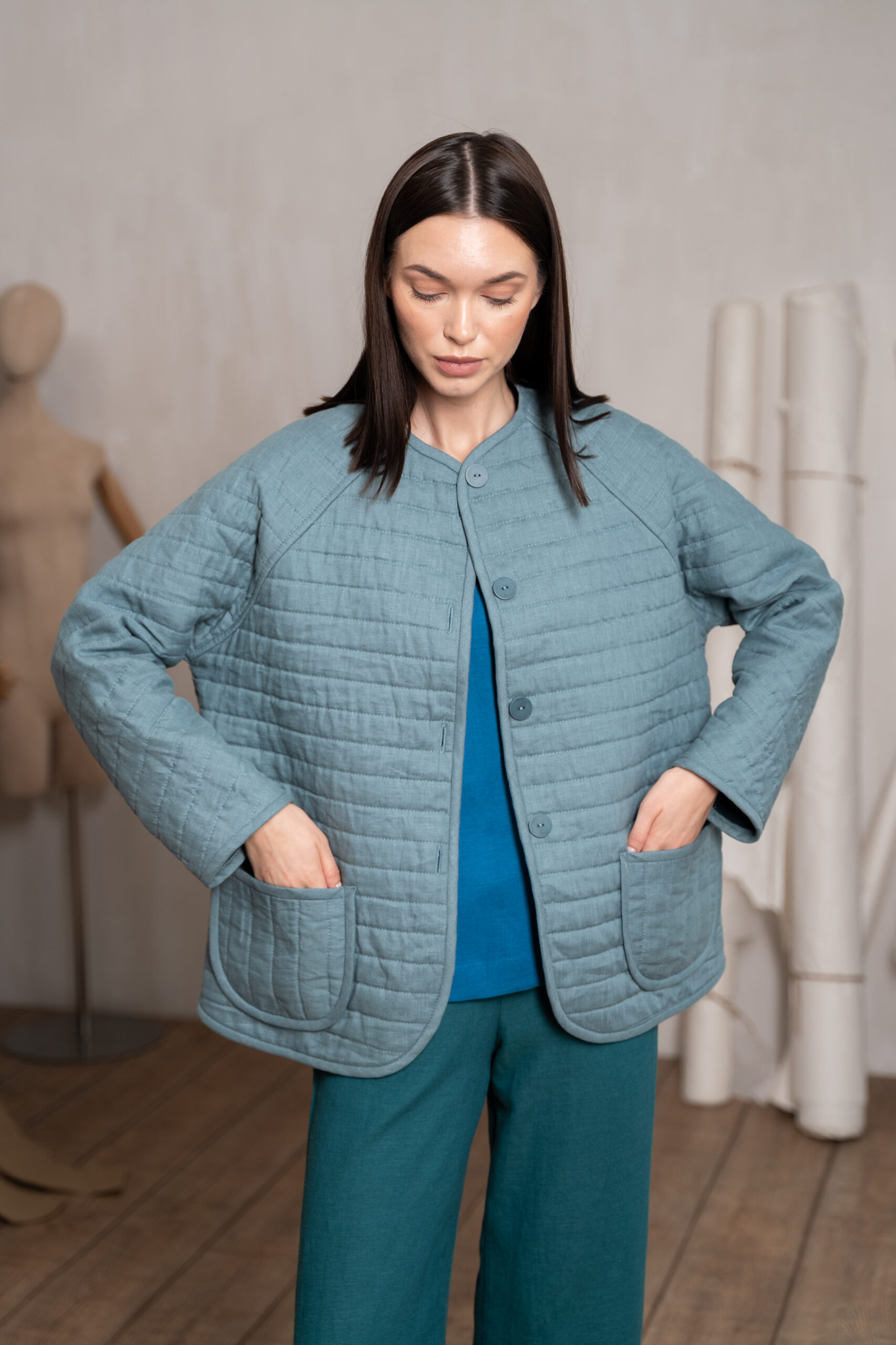 Жакет утепленный стеганный на футере среднего объема длиной до середины бедра. Спинка с цельнокроеным рукавом. Застежка центральная на пуговицы. Горловина округлой формы. Спереди накладные карманы.