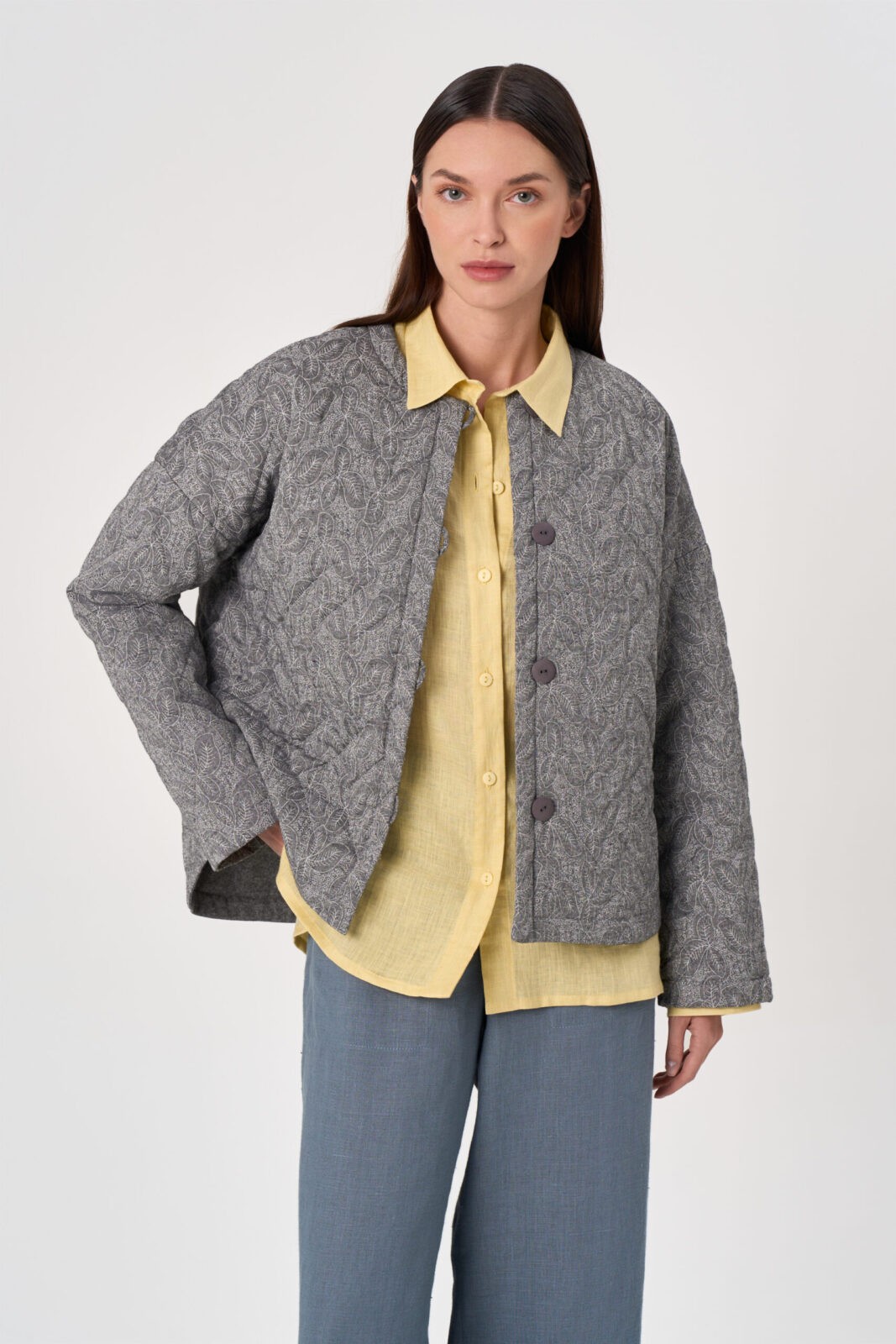 Короткий жакет утепленный стеганный на синтепоне с подкладкой. Спущенный рукав. Застежка центральная на пуговицы и навесные петли. Горловина округлой формы. Низ фигурный с разрезами по бокам.