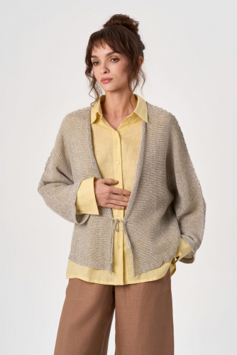 Жакет трикотажный женский полуприлегающего силуэта. Цельновязаный без боковых и плечевых швов. Застежка центральная на декоративный шнур.