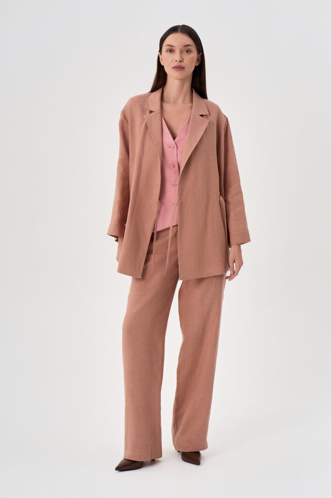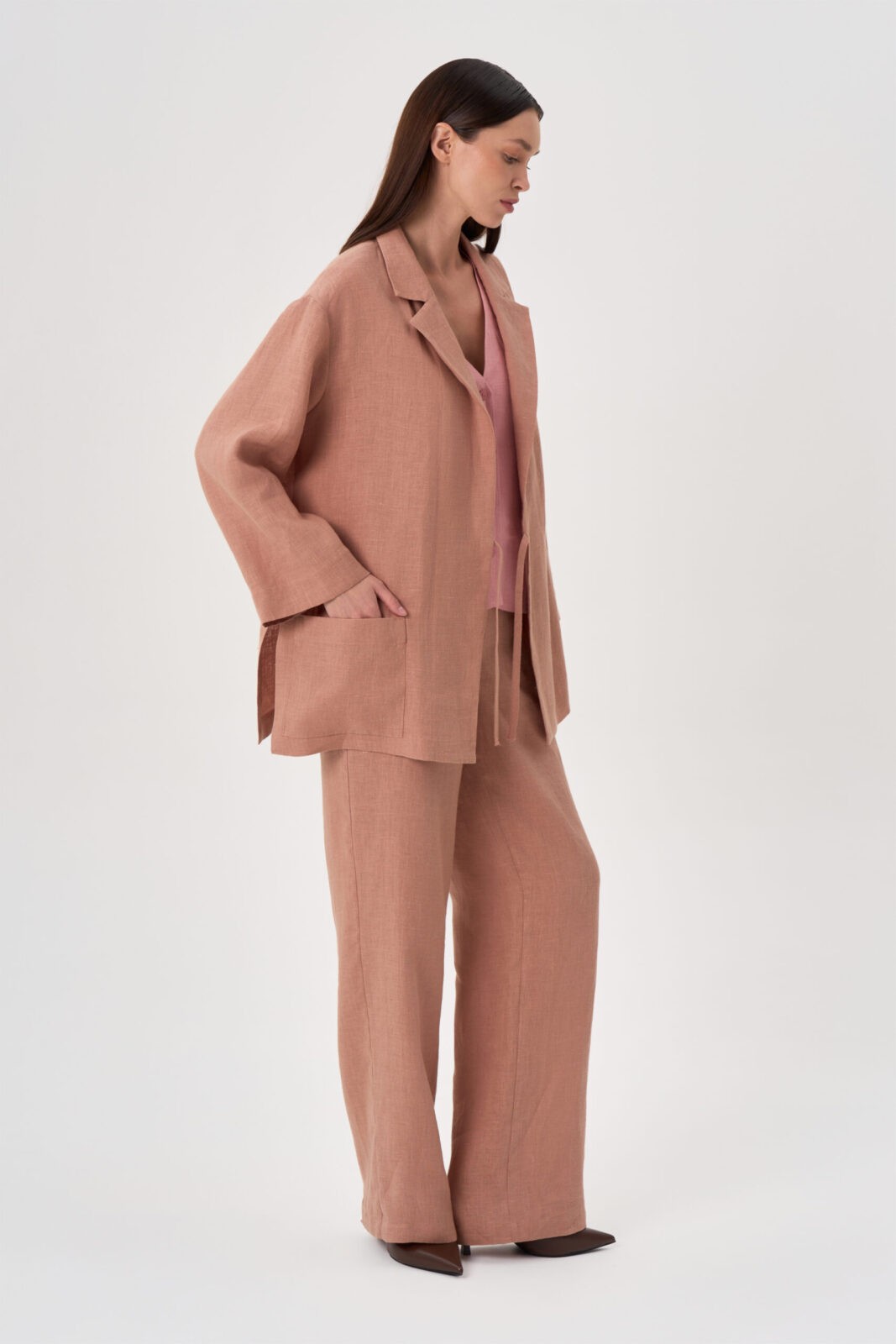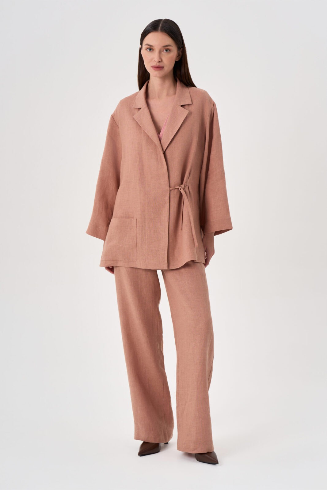 Жакет прямой свободный на запах с завязками и разрезами по бокам. Рукав втачной длинный Воротник «английский» пиджачного типа. Накладной карман.