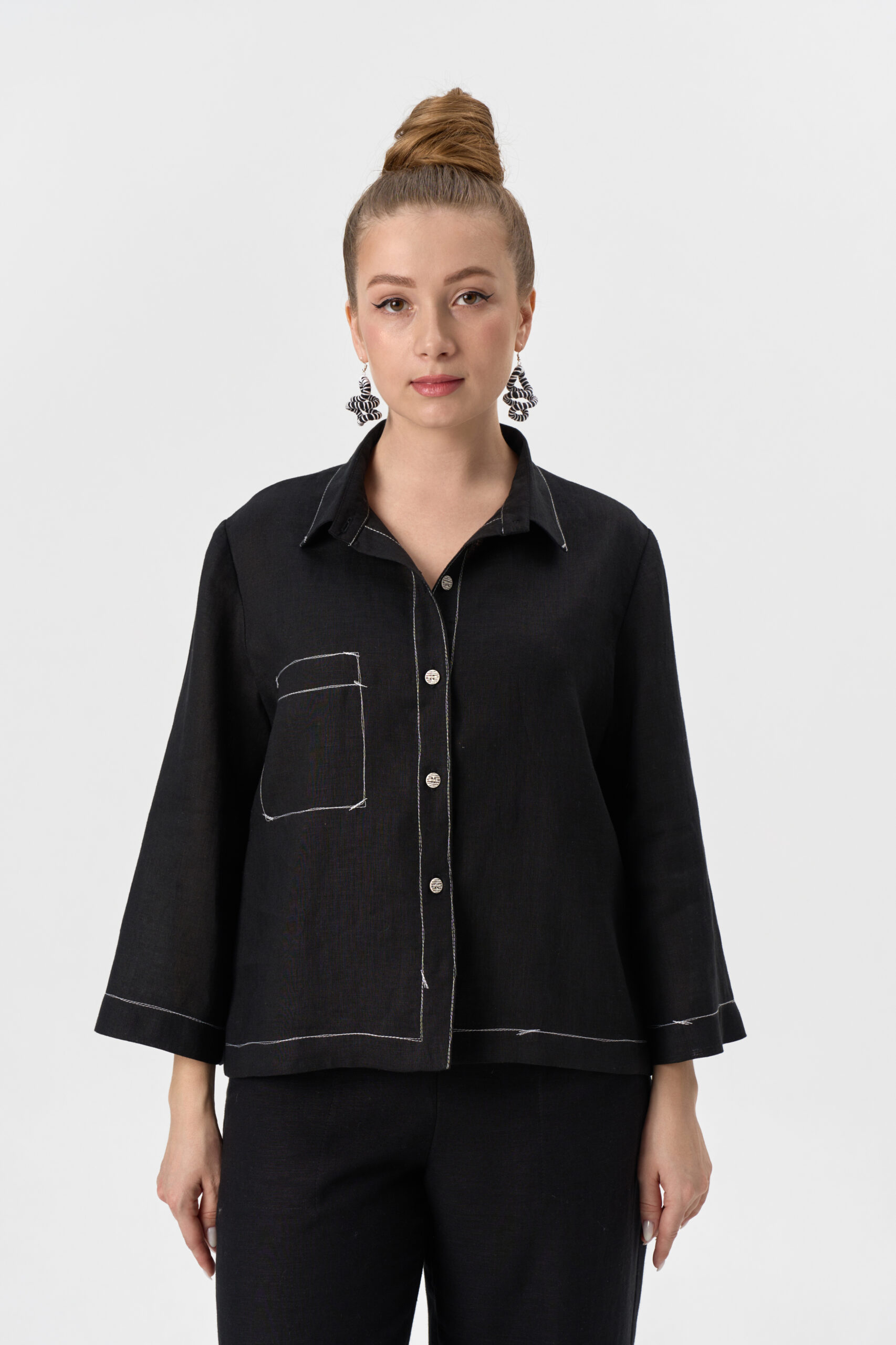 Блузка женская укороченная на кокетке. Рукав втачной длинный. Застежка центральная на пуговицы. Воротник рубашечный на стойке.