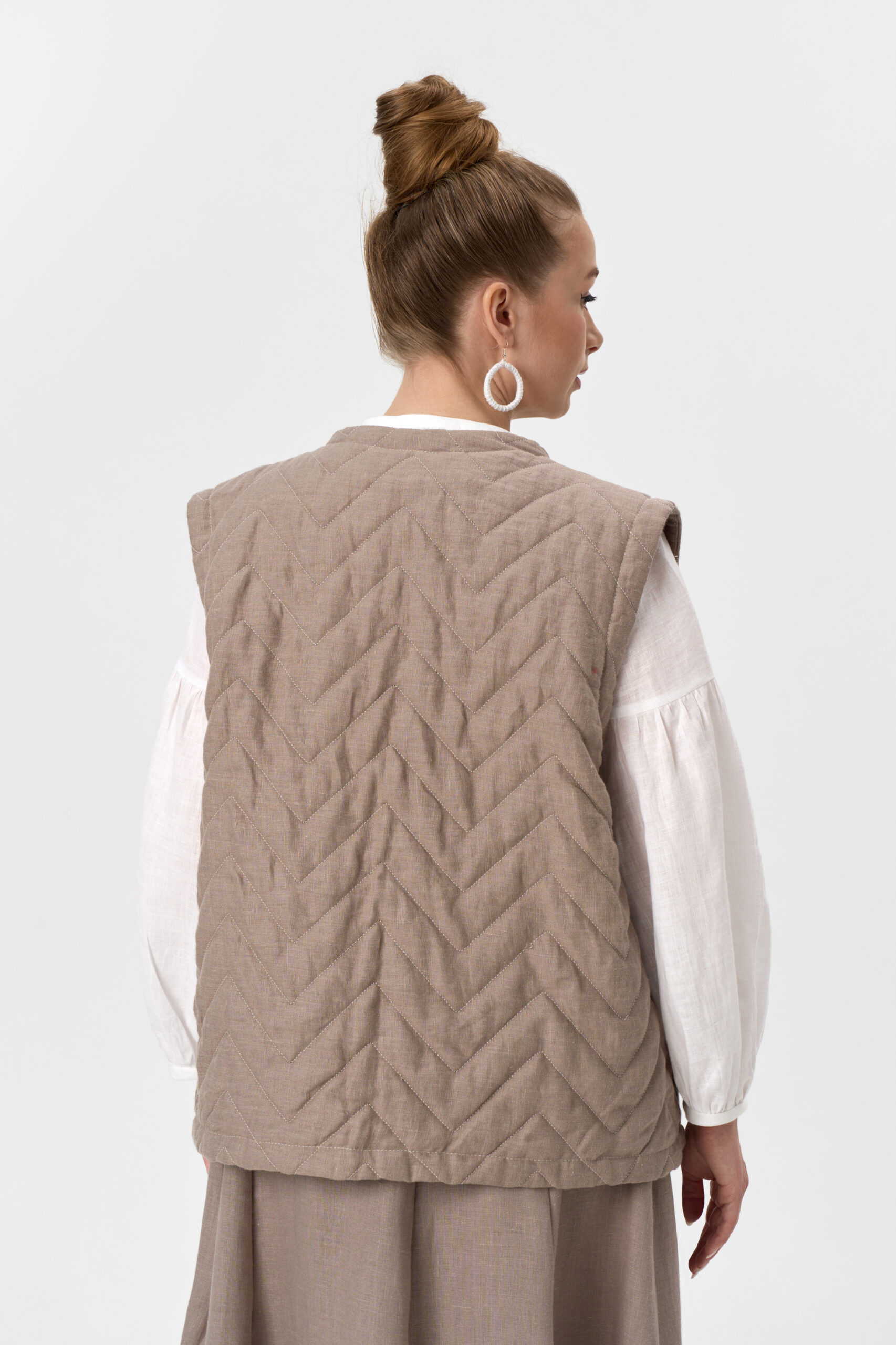 Состав: верх 100% льняная ткань, подклад 50% хлопок+50% вискоза. Плотность ткани: верх 190 г/м2, синтепон 80 г/м2