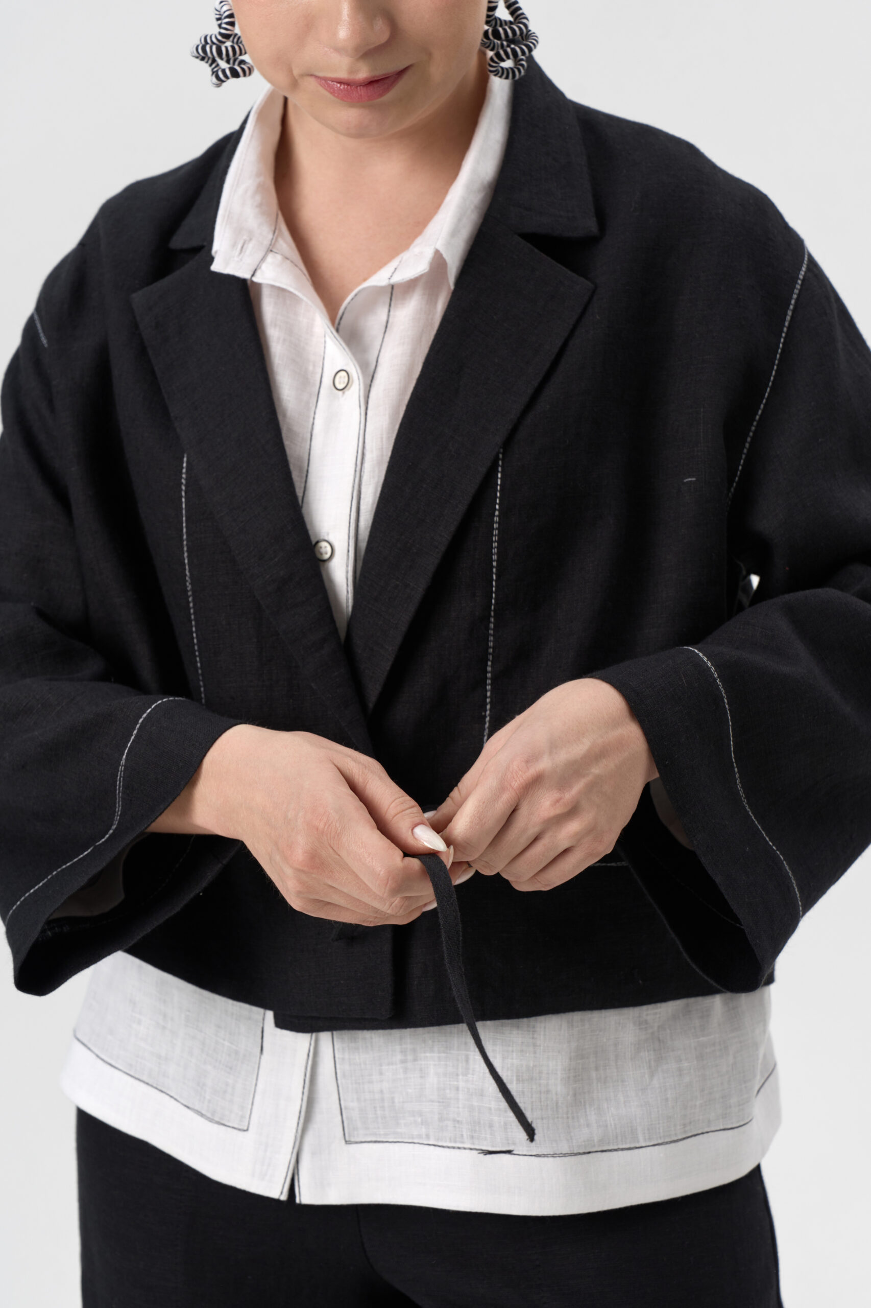 Жакет короткий на запах с завязками и контрастной декоративной строчкой. Рукав втачной длинный. Воротник «английский» пиджачного типа.
