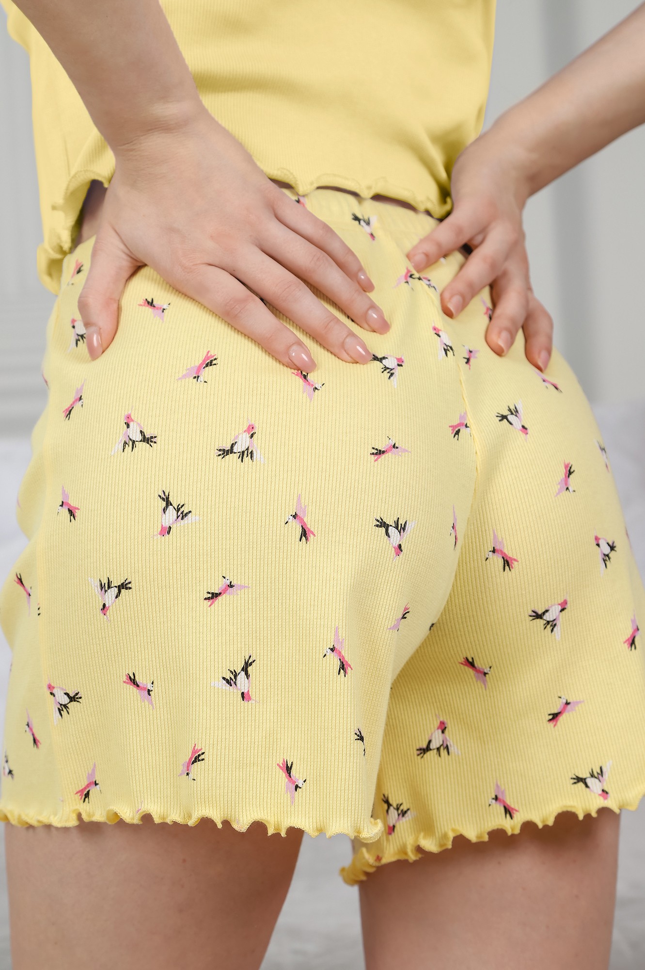 Пижама молодежная из трикотажного полотна «кашкорсе» в комбинации двух видов полотен: гладкокрашеной и с набивным рисунком, состоящая из майки-топа и шорт. Майка-топ – слегка расширенная книзу, на узких бретелях, с V-образным вырезом спереди и печатью на полочке, выполненной в технике «шелкографии». Низ изделия обработан узкой обметочной строчкой.Шорты - укороченные, с эластичной тесьмой по талии, расширенные книзу. Нижние срезы шорт обработаны узкой обметочной строчкой, создающей красивый волнистый край.