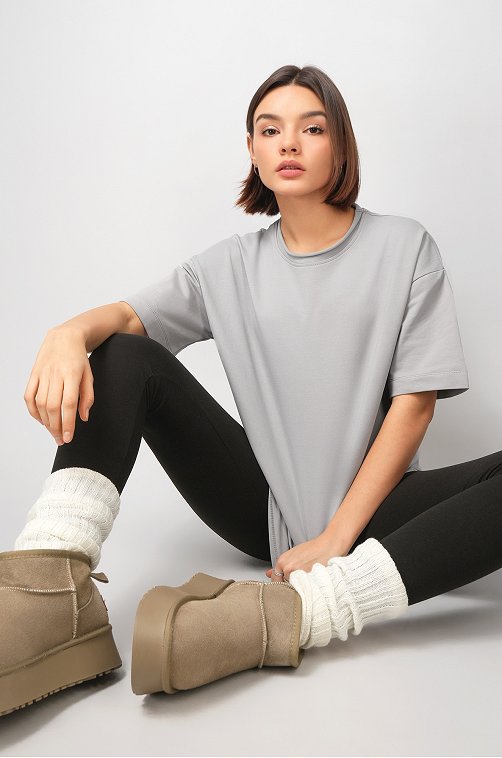 Женская футболка светло-серого цвета выполнена в популярном стиле оверсайз. Её свободный крой со спущенным плечом создаёт расслабленный силуэт. Особый шарм трикотажной модели придает нарочито необработанный край горловины.