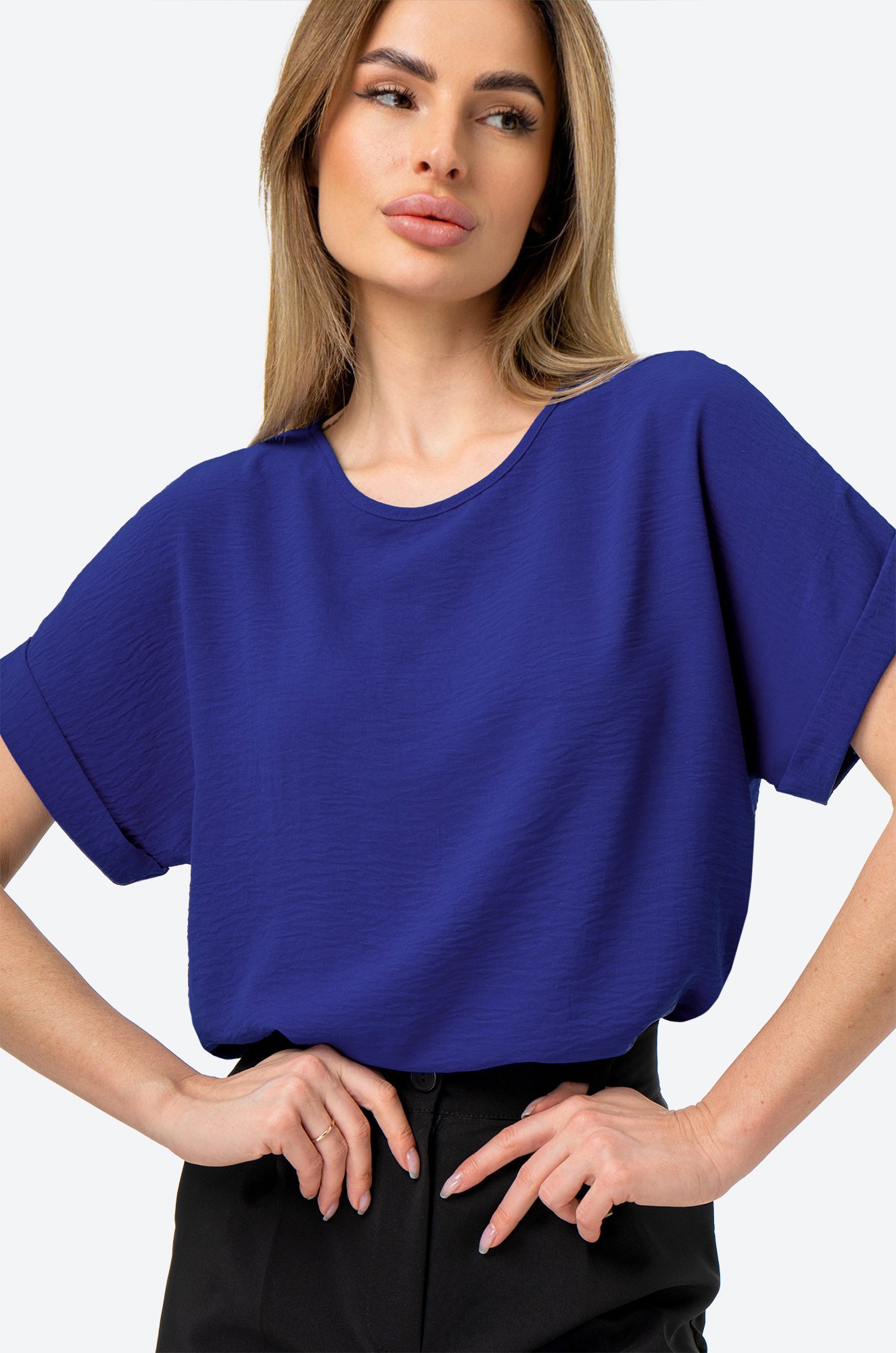 Забудьте про глажку! Модель выполнена из ткани, которая не мнется. Благодаря своим свойствам синяя блуза красиво драпируется на теле, создавая воздушные складки и небрежные линии.