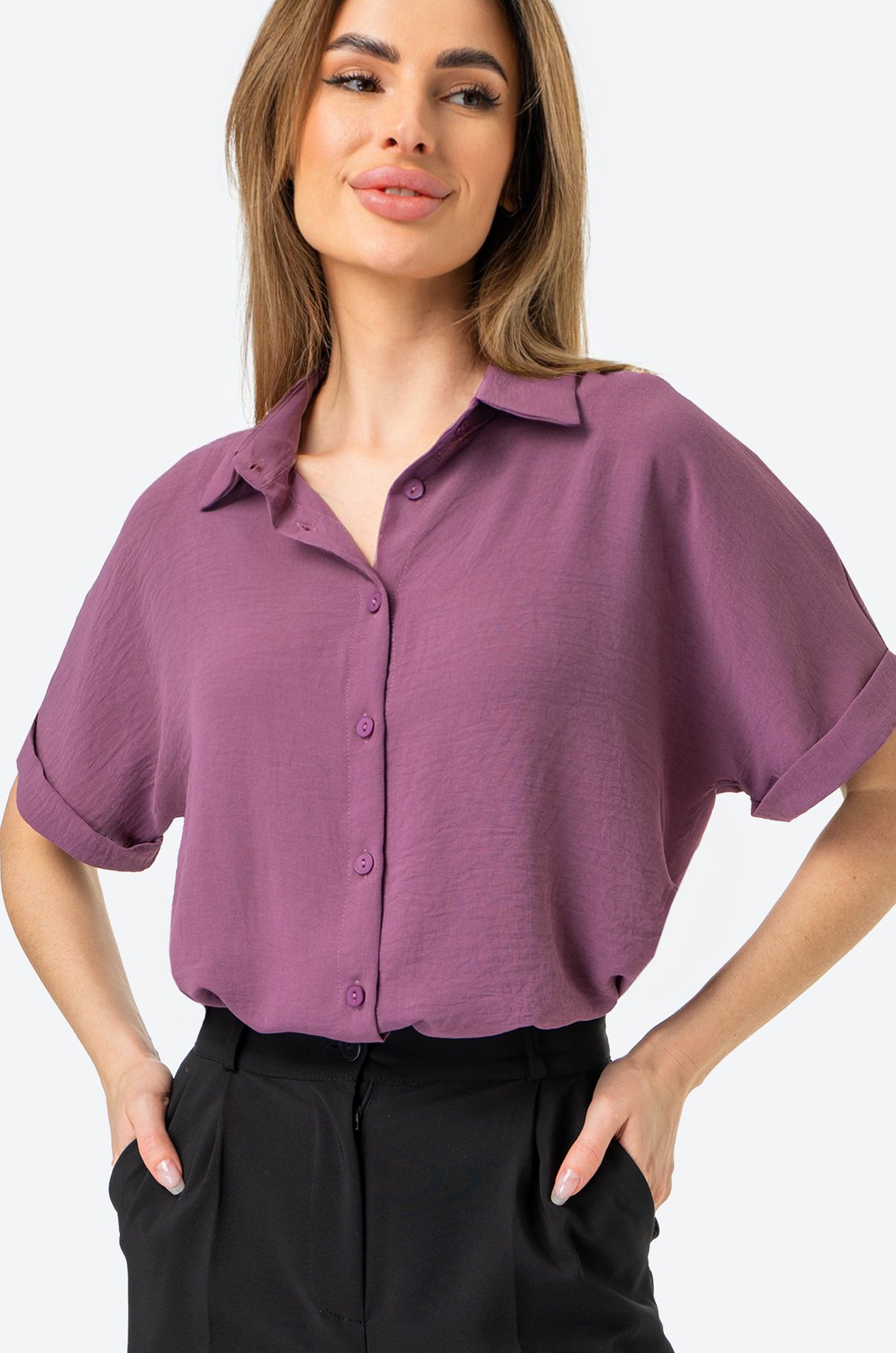 Забудьте про глажку! Рубашка сливового цвета для женщин выполнена из ткани жатка, которая не мнется. Благодаря своим свойствам бордово-фиолетовая рубашка красиво драпируется на теле, создавая воздушные складки и небрежные линии.