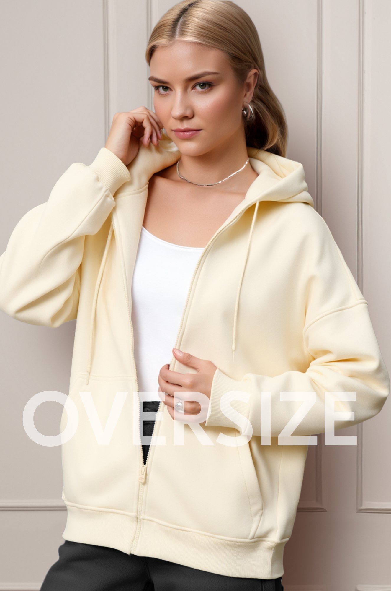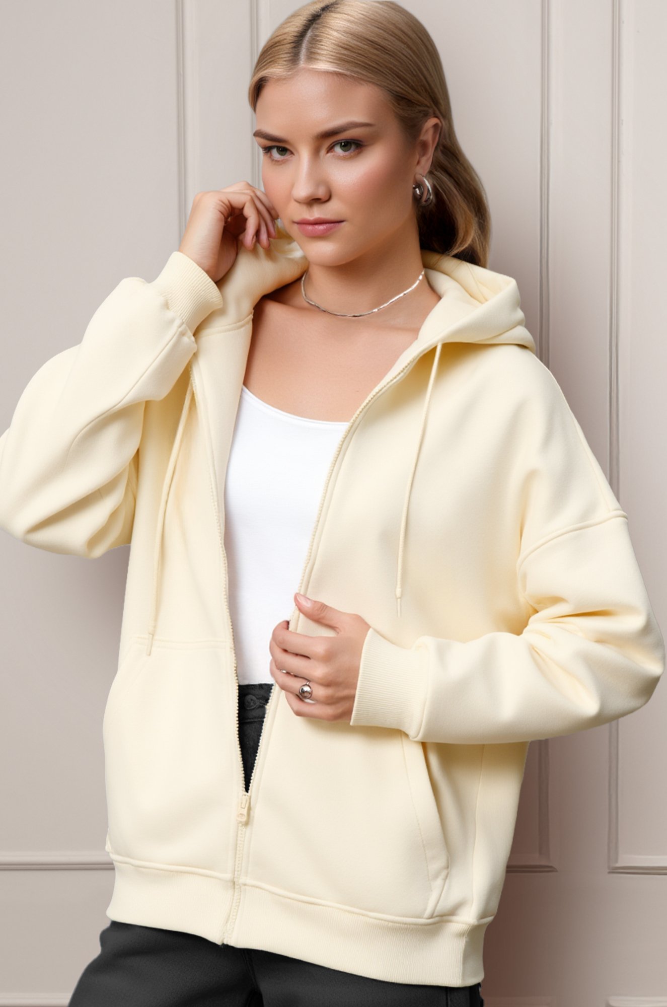 Женская толстовка на молнии — неотъемлемый элемент вашего образа. Молочный оттенок, практичный дизайн и мягкая хлопковая ткань делают её идеальной для любого времени года.