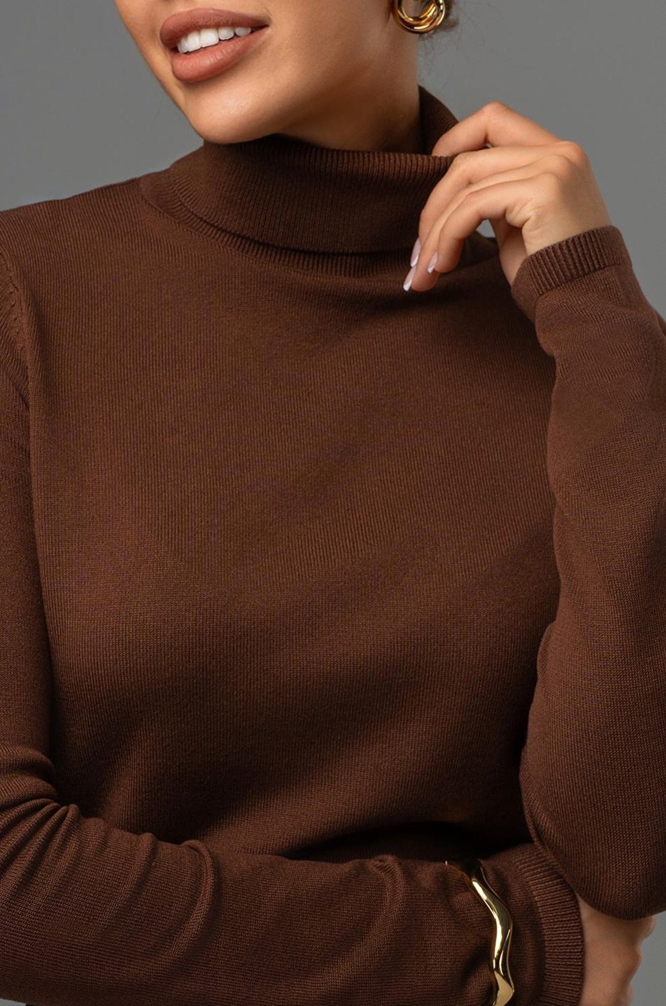 Однотонный бадлон шоколадного цвета для женщин станет незаменимой частью капсульного гардероба: облегающая водолазка одинаково хорошо смотрится в строгом офисном образе и в расслабленном smart casual стиле.