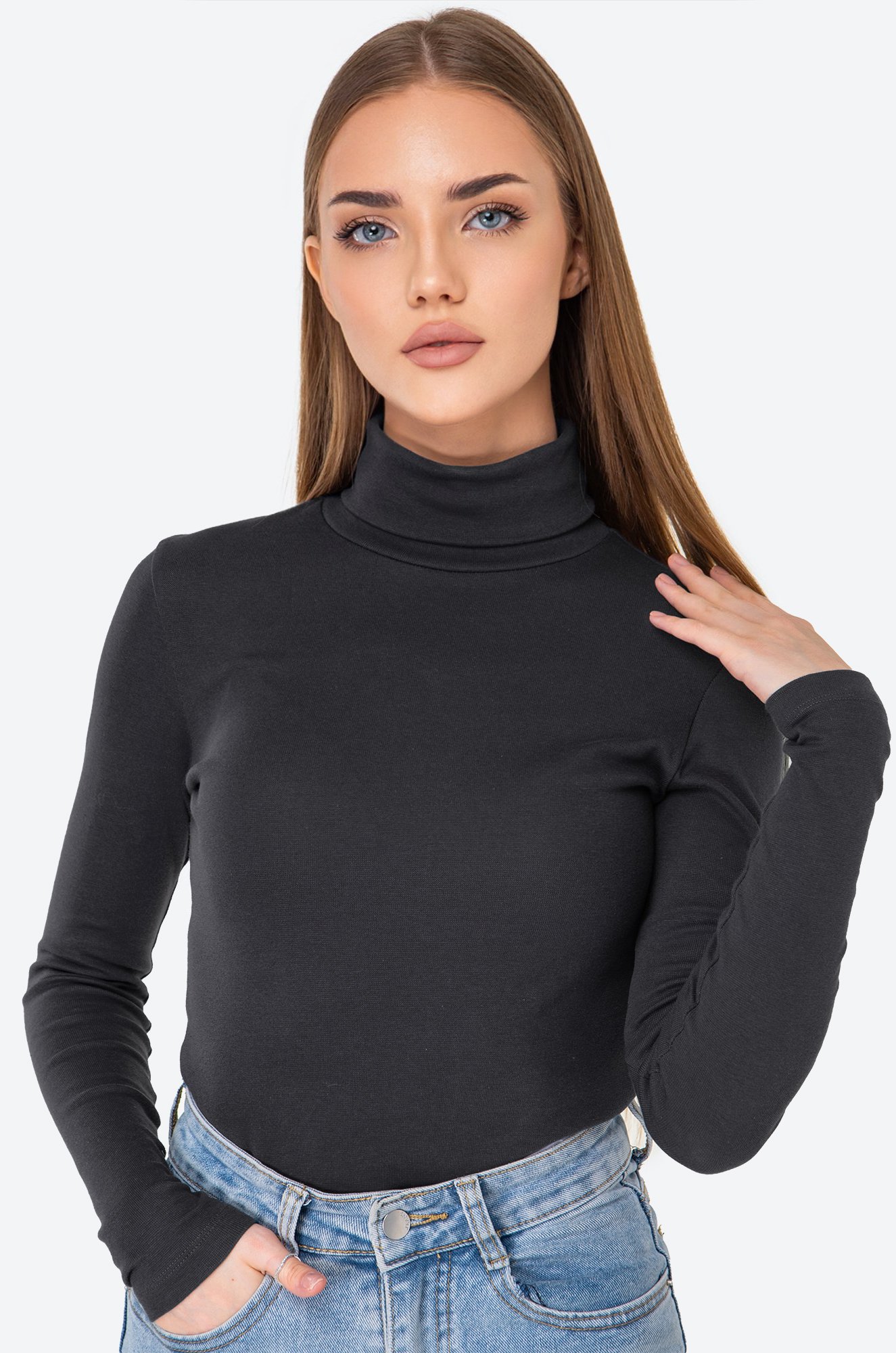 Трикотажная базовая водолазка для женщин выполнена в графитовом цвете с высокой горловиной – прекрасный вариант для капсульного гардероба.