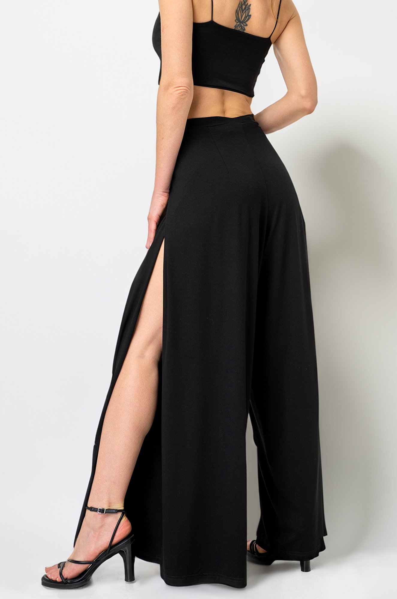 Комфорт и свобода! Оригинальные женские брюки палаццо черного цвета выполнены из легкого струящегося трикотажа вискоза. Широкие брюки с запахом и высокими разрезами фиксируются завязками на поясе. Высокая талия дарит комфортную посадку.
