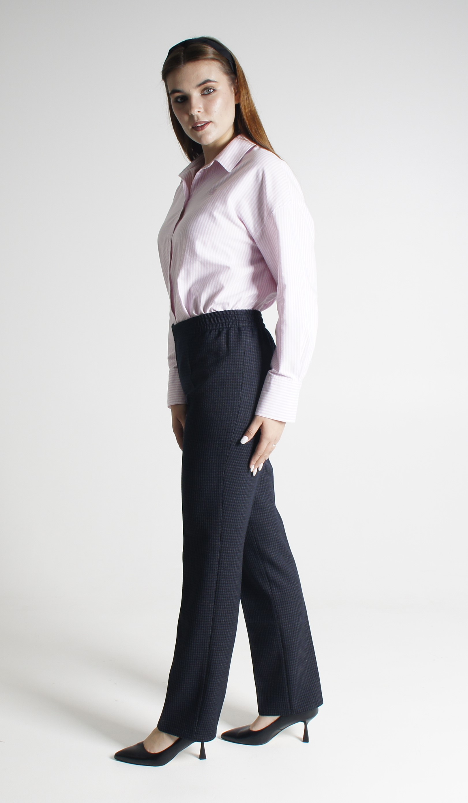 Чисто женская модель для объёмных фигур. Из плотной костюмной ткани..Без молнии, пояс на резинке -очень удобны и практичны.Длина по боковому шву 107 см, по шаговому 82 см. Состав: Вискоза 65%, Полиэстер 30%, Эластан 5%.