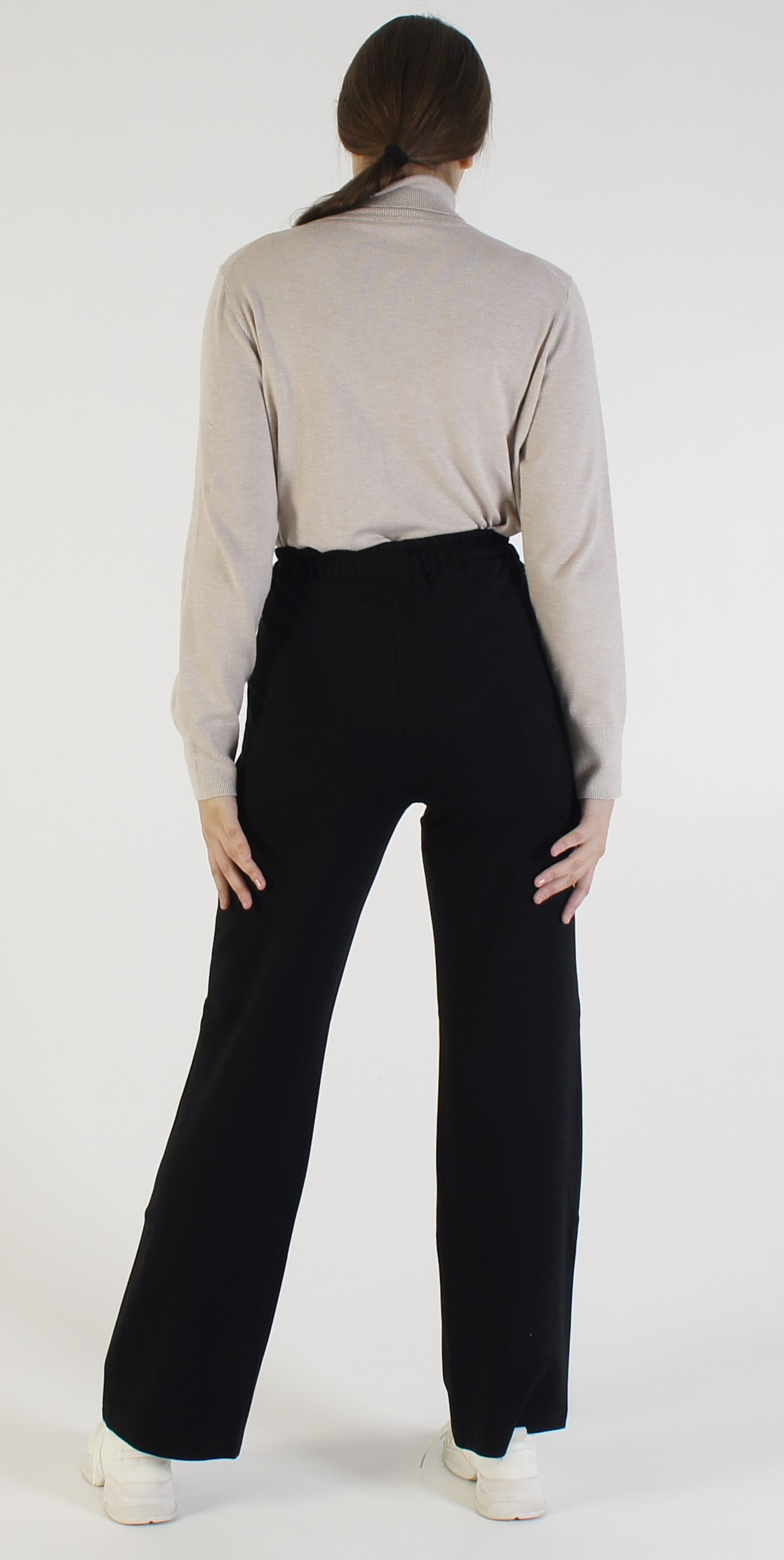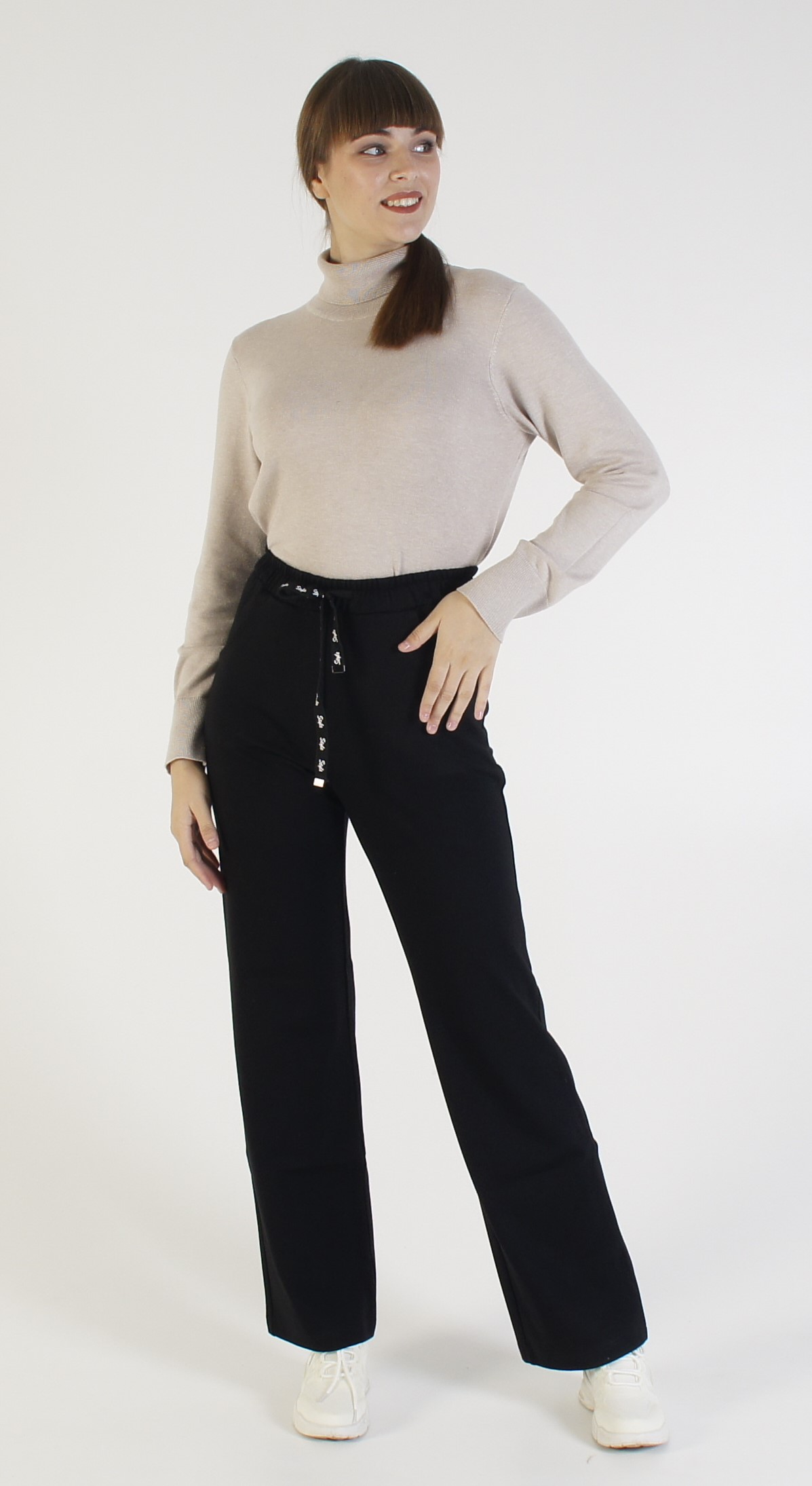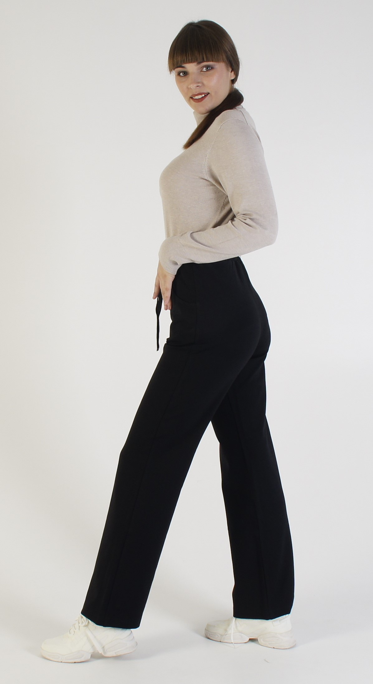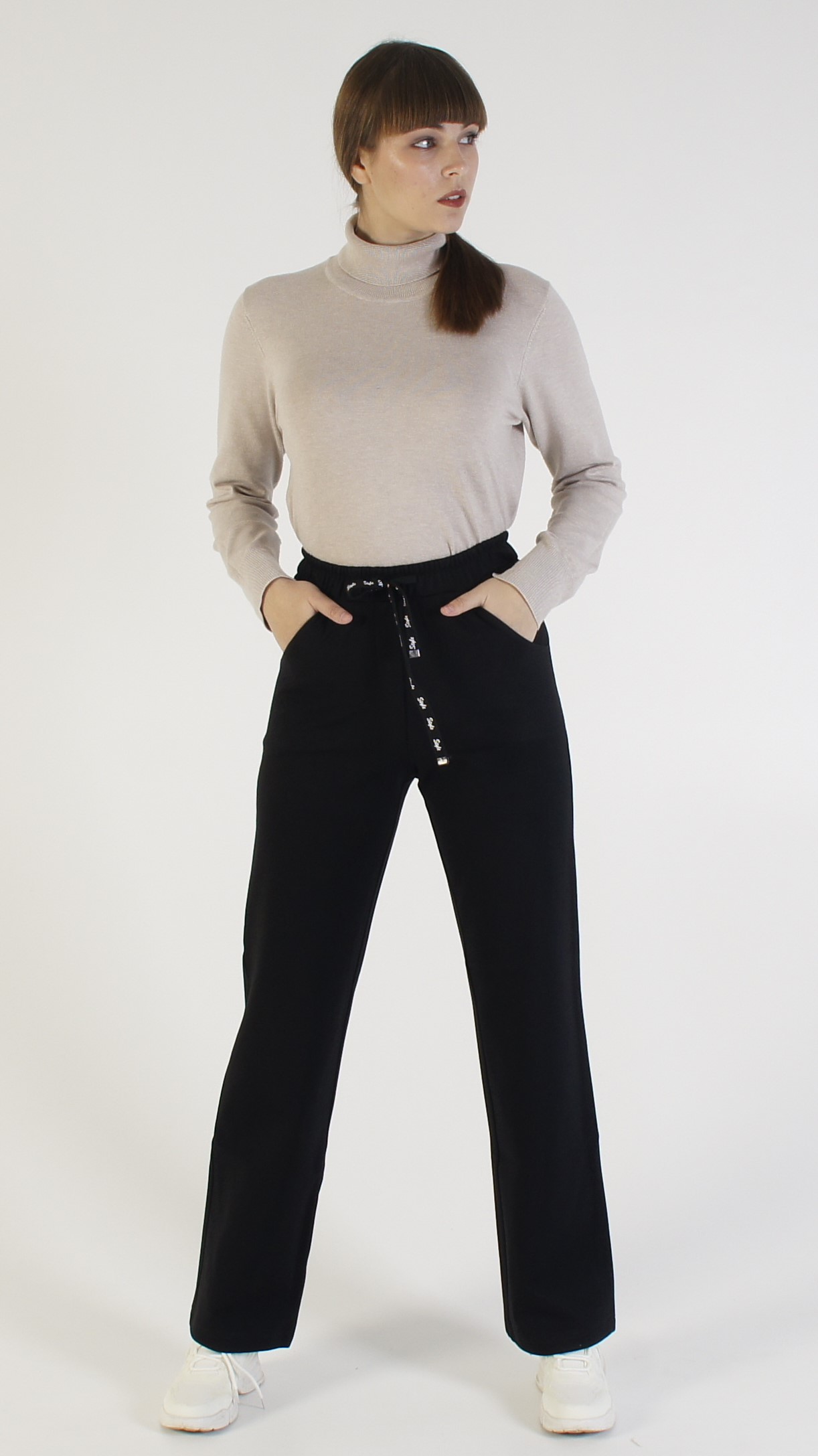 Брюки из плотного трикотажа прямого силуэта с передними карманами.Пояс на резинке со шнурком.Длина 103 см.