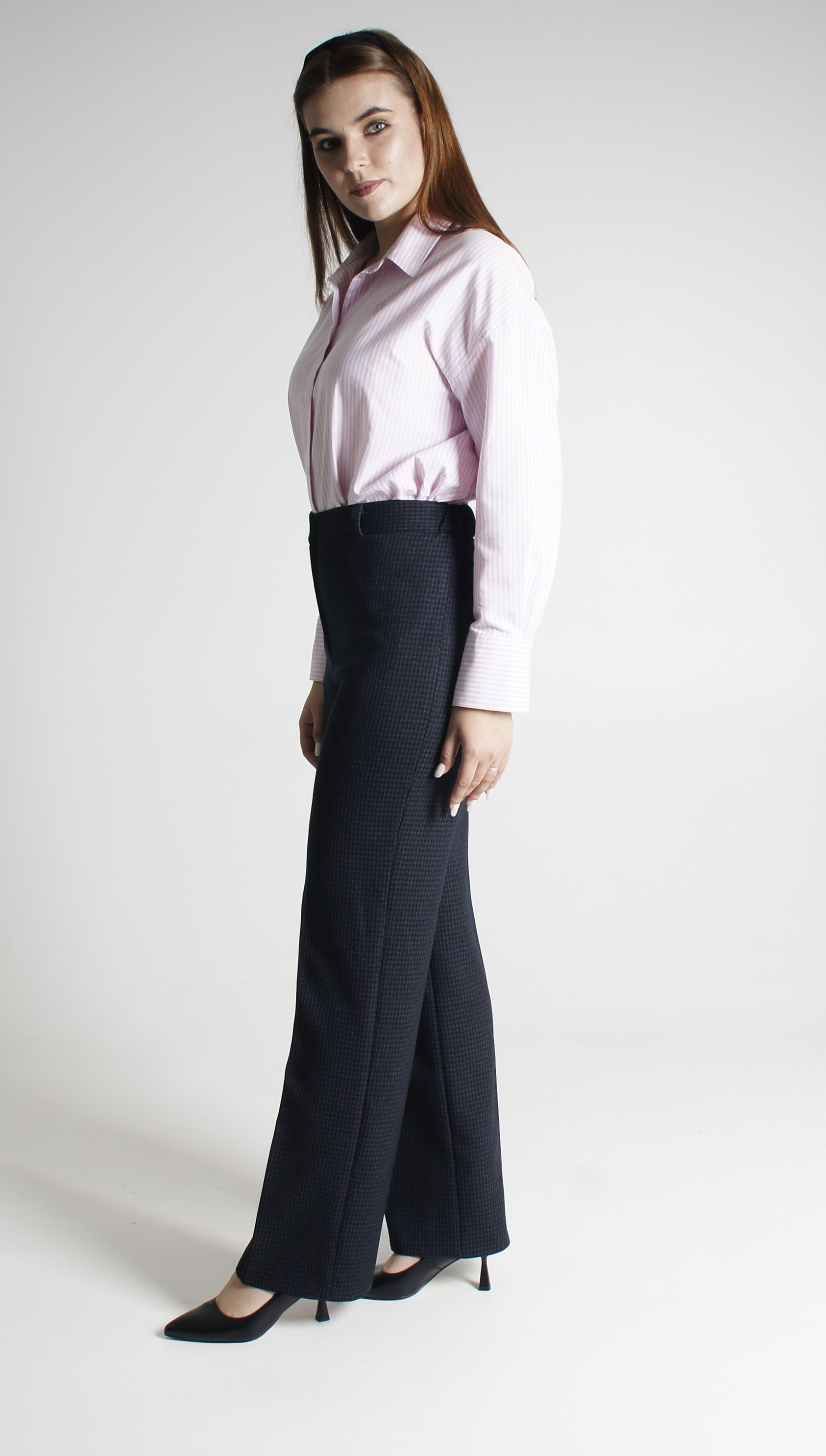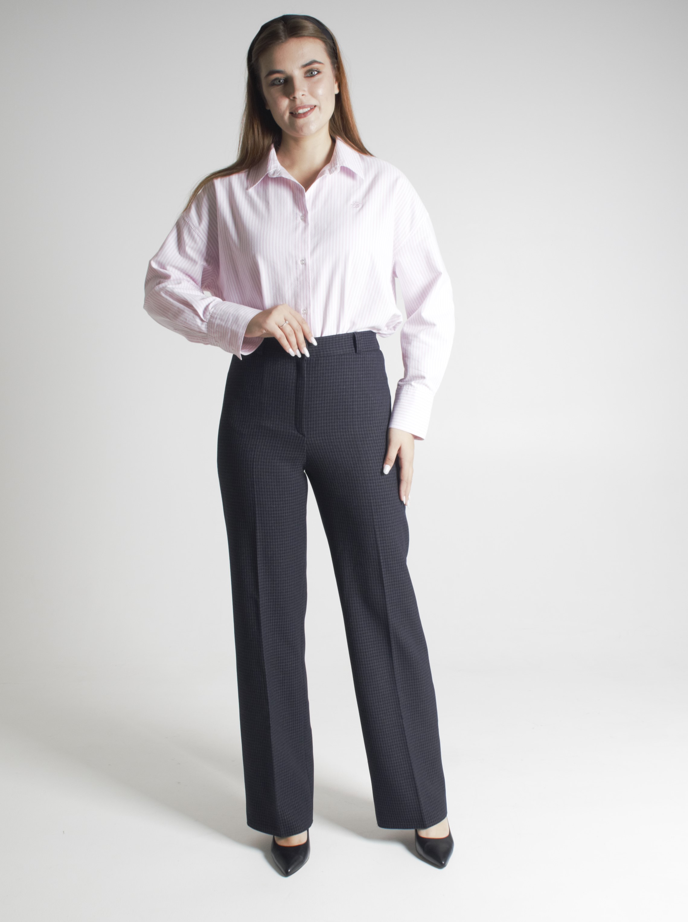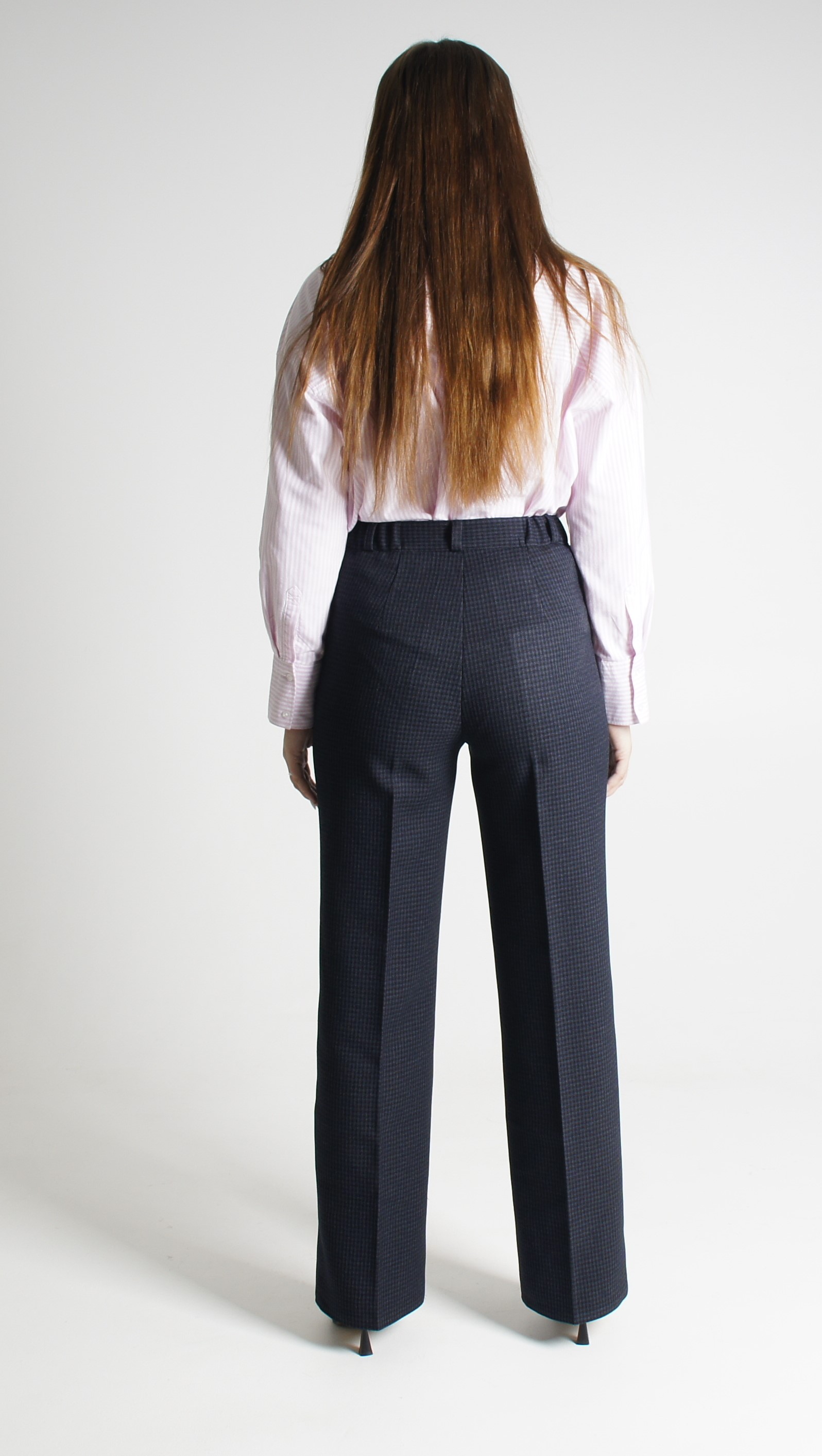 Брюки прямого покроя, верх на поясе шириной 5 см, сбоку на резинке, застёжка на молнии с пуговкой.Имеются шлевки для ремня.Ткань: синяя клетка на черном фоне, плотная.Состав ткани: Полиэстер 30%, Вискоза 65%. Эластан 5%.Длина 110 см по боковому шву и 86 см по внутреннему.Ширина внизу 48 см.Замеры соответствуют 44 размеру.