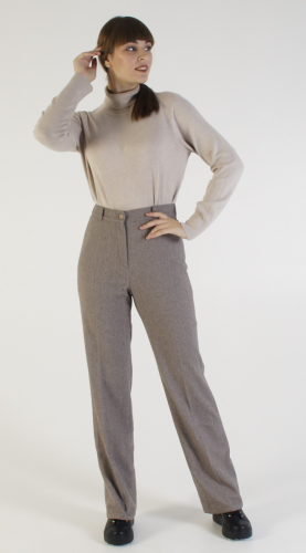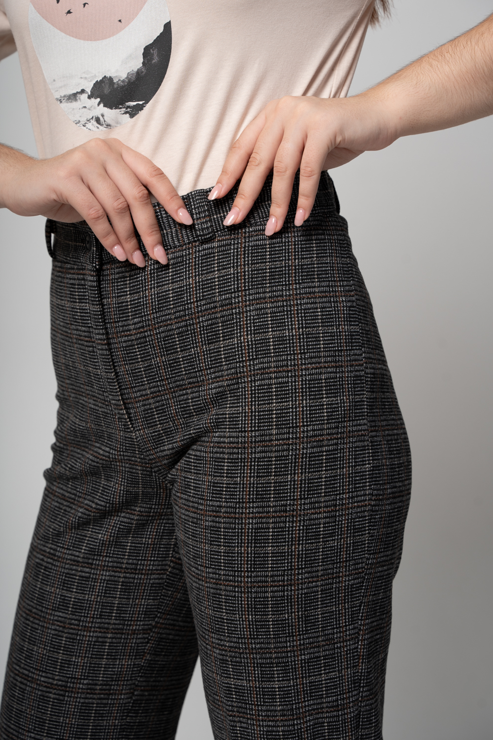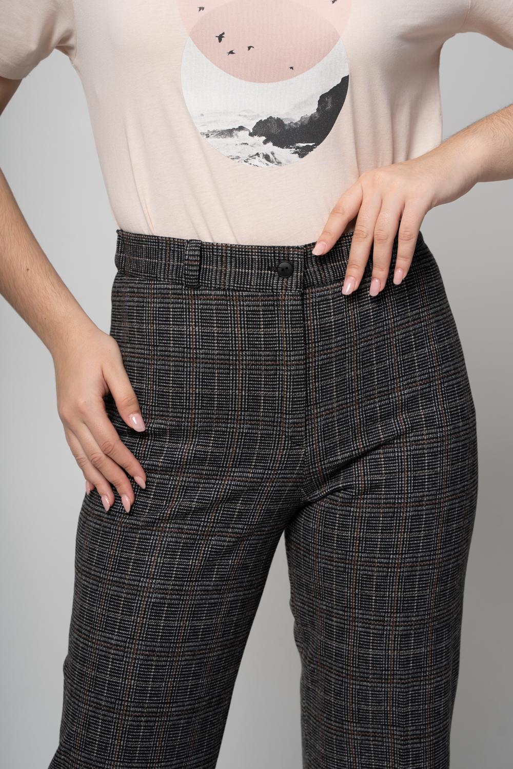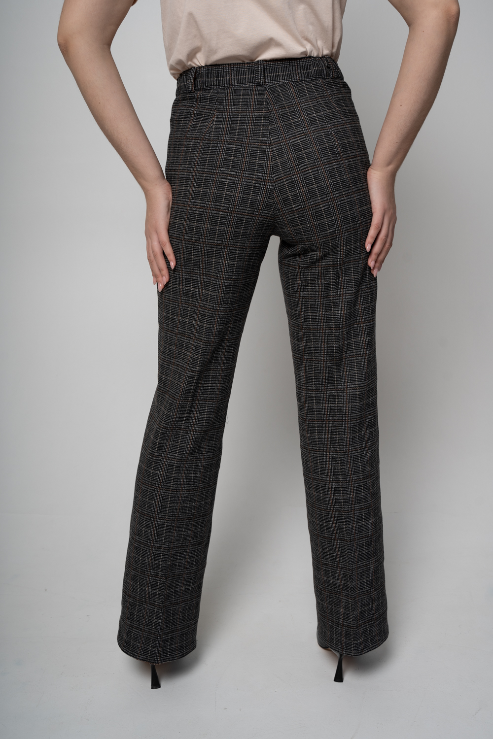 Брюки прямого кроя из костюмной ткани в клетку, верх на поясе шириной 4 см, сбоку на резинке, застёжка на молнии с пуговкой.Имеются шлевки для ремня.Состав ткани: Вискоза 65%, Полиэстер 30%, Эластан 5%. Длина 108 см, по шаговому 85 см , ширина внизу 25 см.Замеры соответствуют 48 размеру.