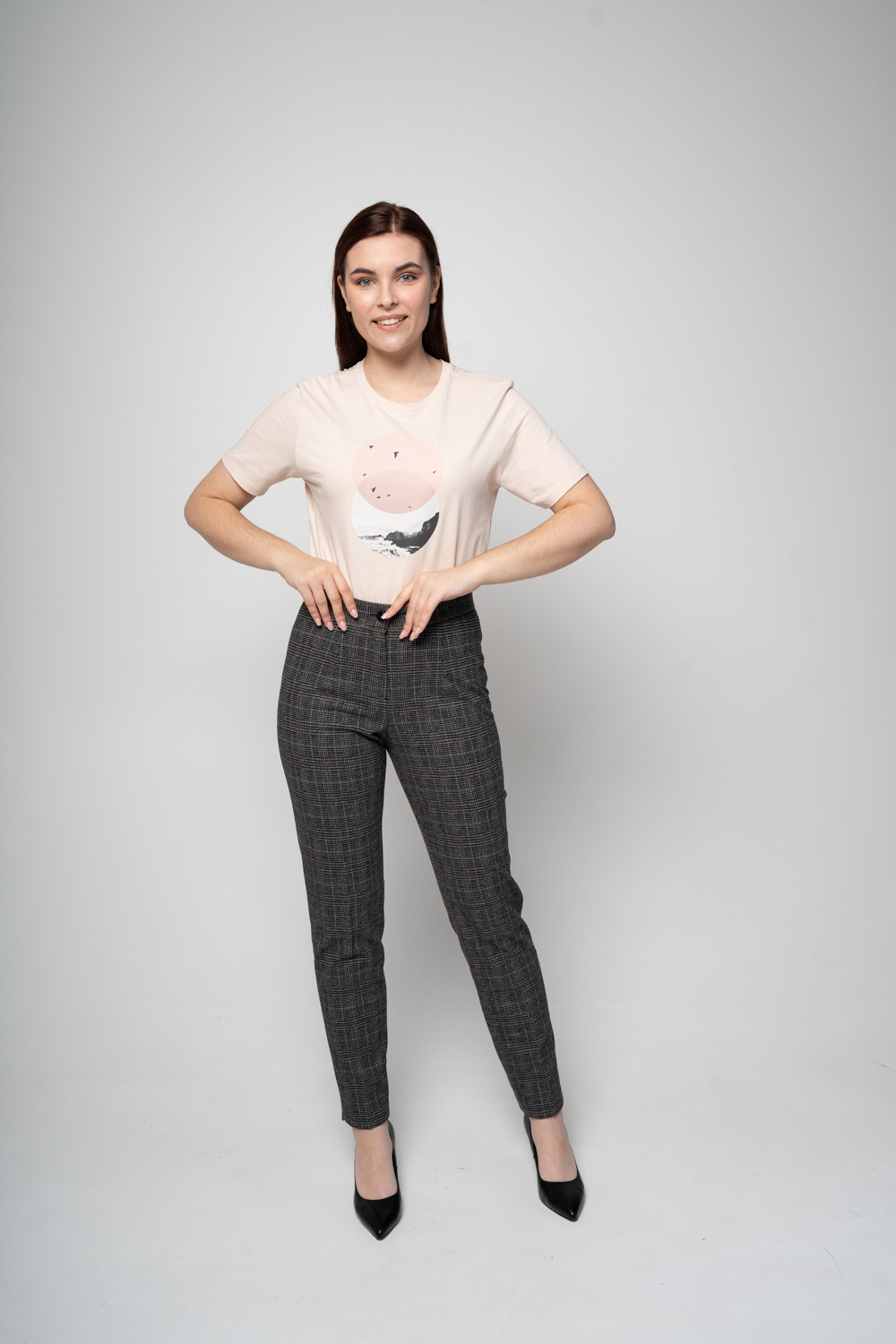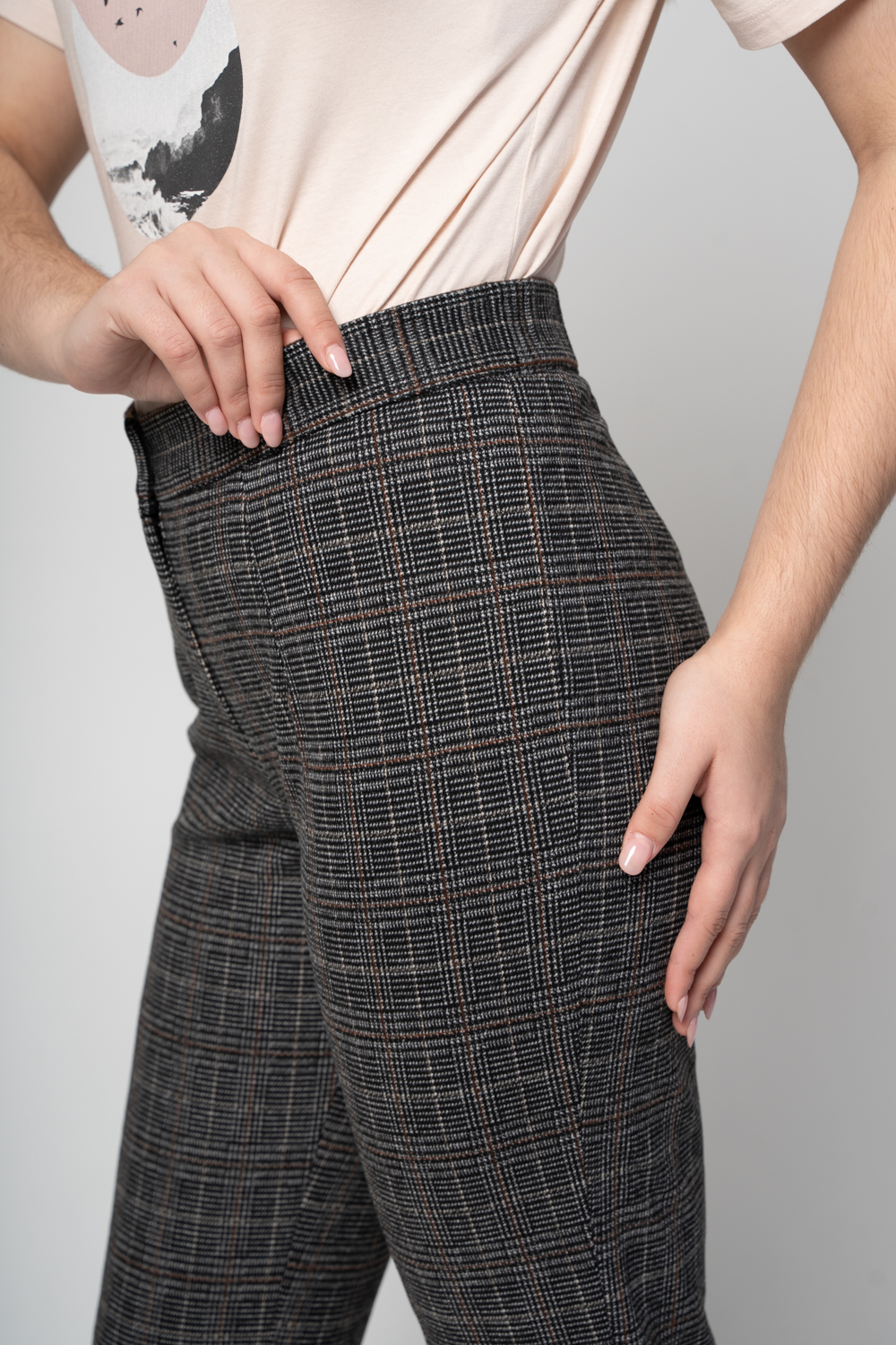 Брюки классического кроя, зауженные книзу, с разрезиком.Застежка на молнии и пуговке.На поясе сзади-резинка.Длина 100 см.Ткань- мягкая костюмная клетка.Состав: Вискоза 65%, Полиэстер 30%, Эластан 5%.