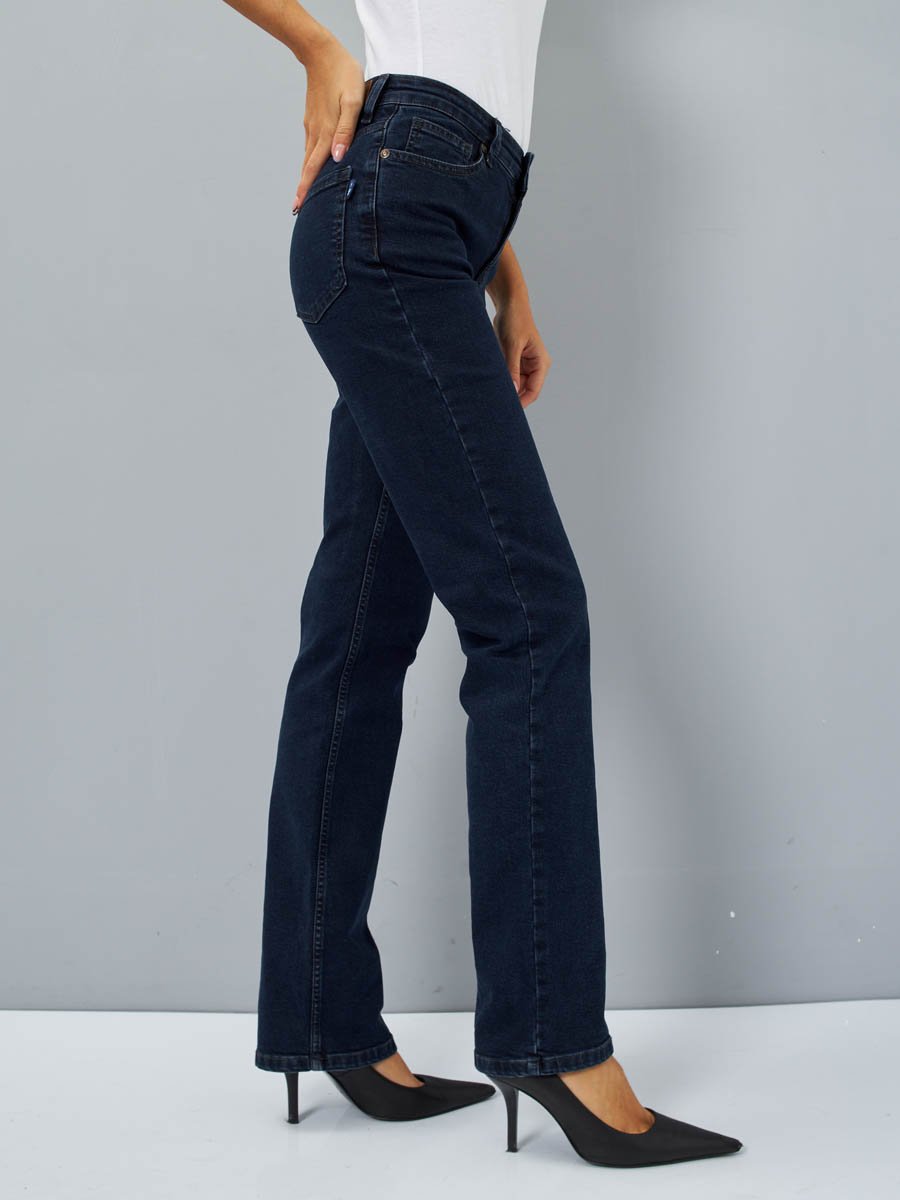 Женские классические джинсы с пятью карманами. Посадка Regular fit (полуоблегающие по бедру). Для улучшения  посадки по талии сделан подкройной пояс из 2-х частей. Средняя высота талии спереди и высокая сзади. Застежка на молнии. Немного зауженные к низу. Выполнены из слабоэластичной ткани denim comfort stretch, цвет ткани Blue/Black(лицевая сторона ткани темно-синяя, изнаночная сторона- черная). Темная стирка "stone wash".