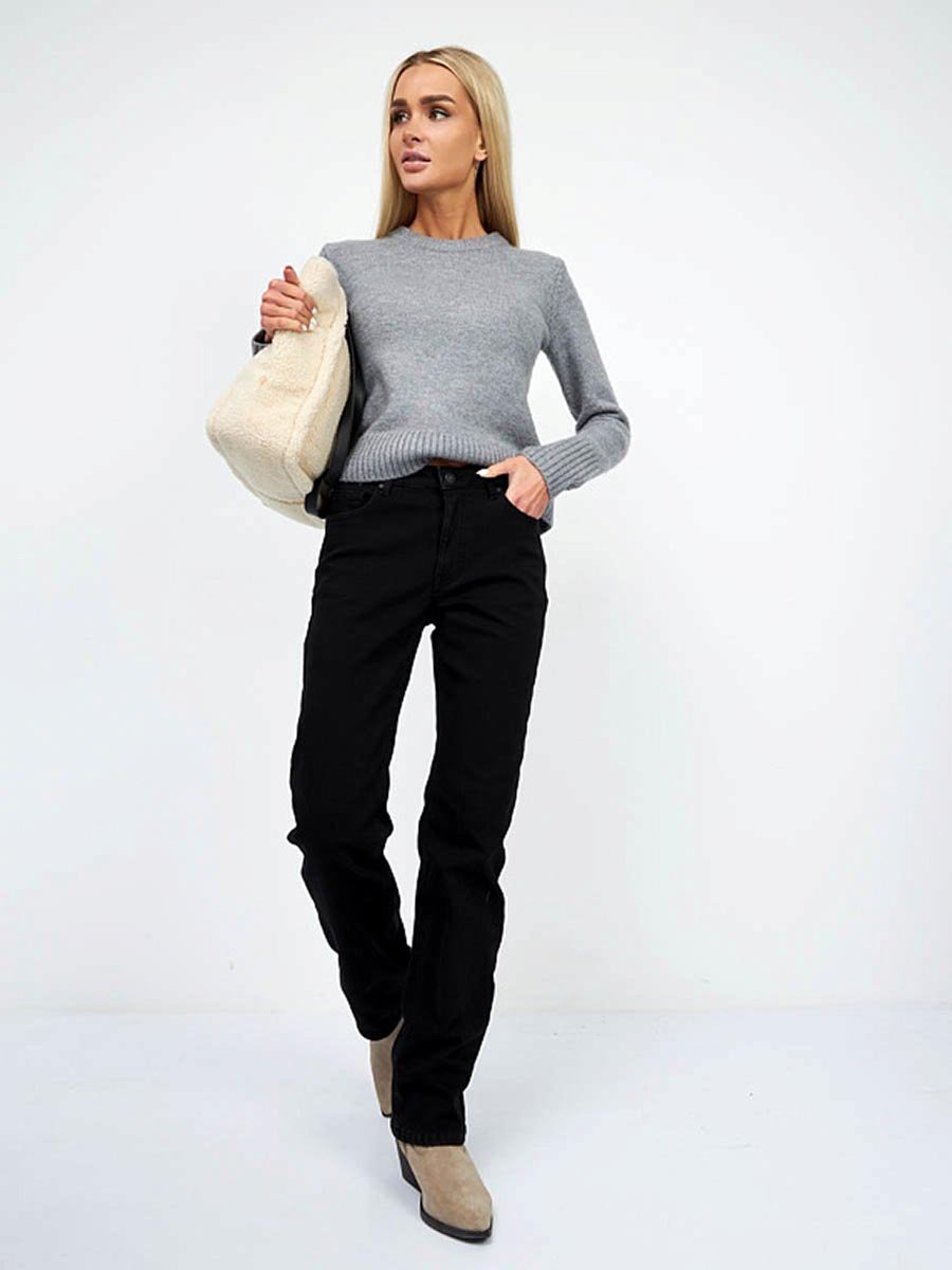 Женские классические утепленные джинсы с пятью карманами. Посадка Regular fit (полуоблегающие по бедру). Для улучшения посадки по талии сделан подкройной пояс из 2-х частей. Высокая талия. Застежка на молнии. Немного зауженные к низу. Выполнены из утепленной слабоэластичной ткани Black denim comfort stretch, к изнаночной ткани прикреплена дополнительная трикотажная ткань (флис) с мягким, шелковистым и приятным на ощупь ворсом.Темная стирка со слабовыраженными потертостями по швам.