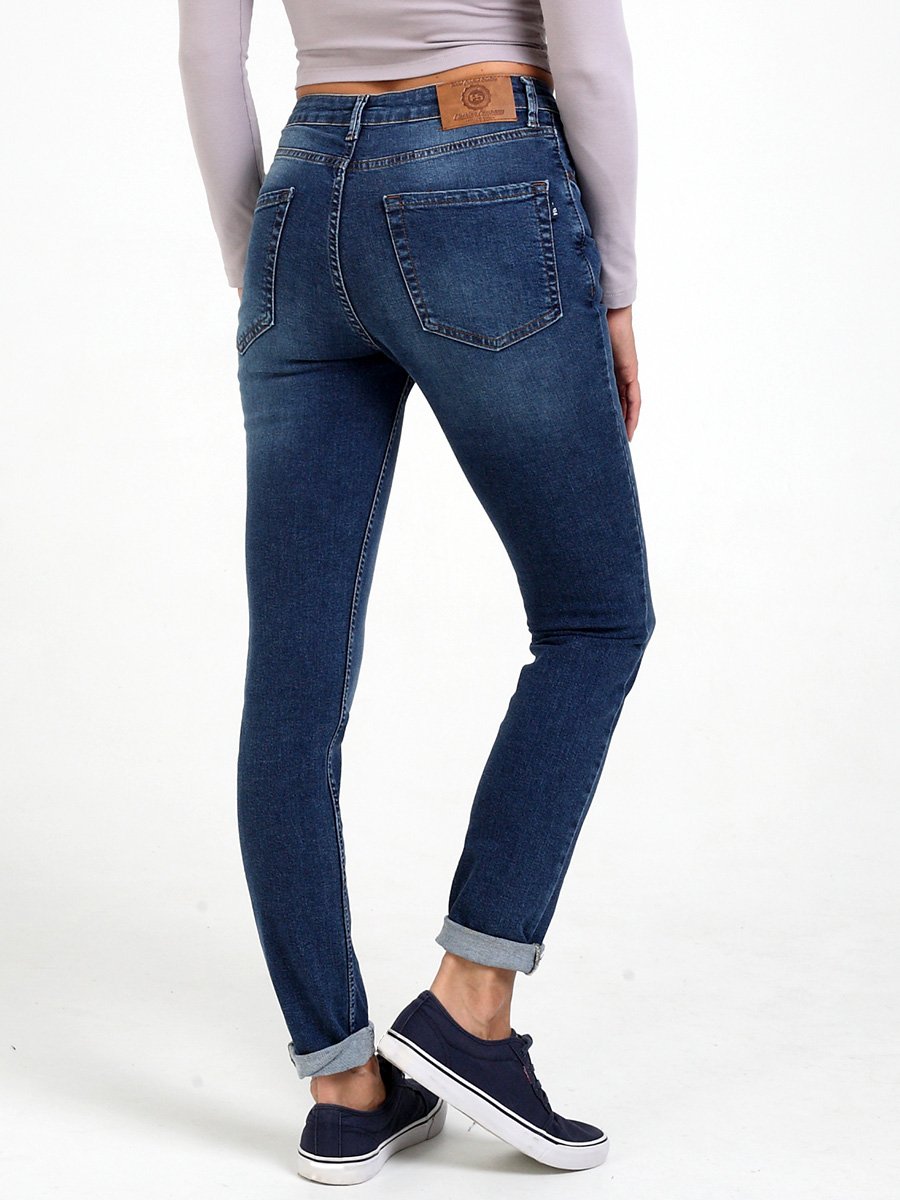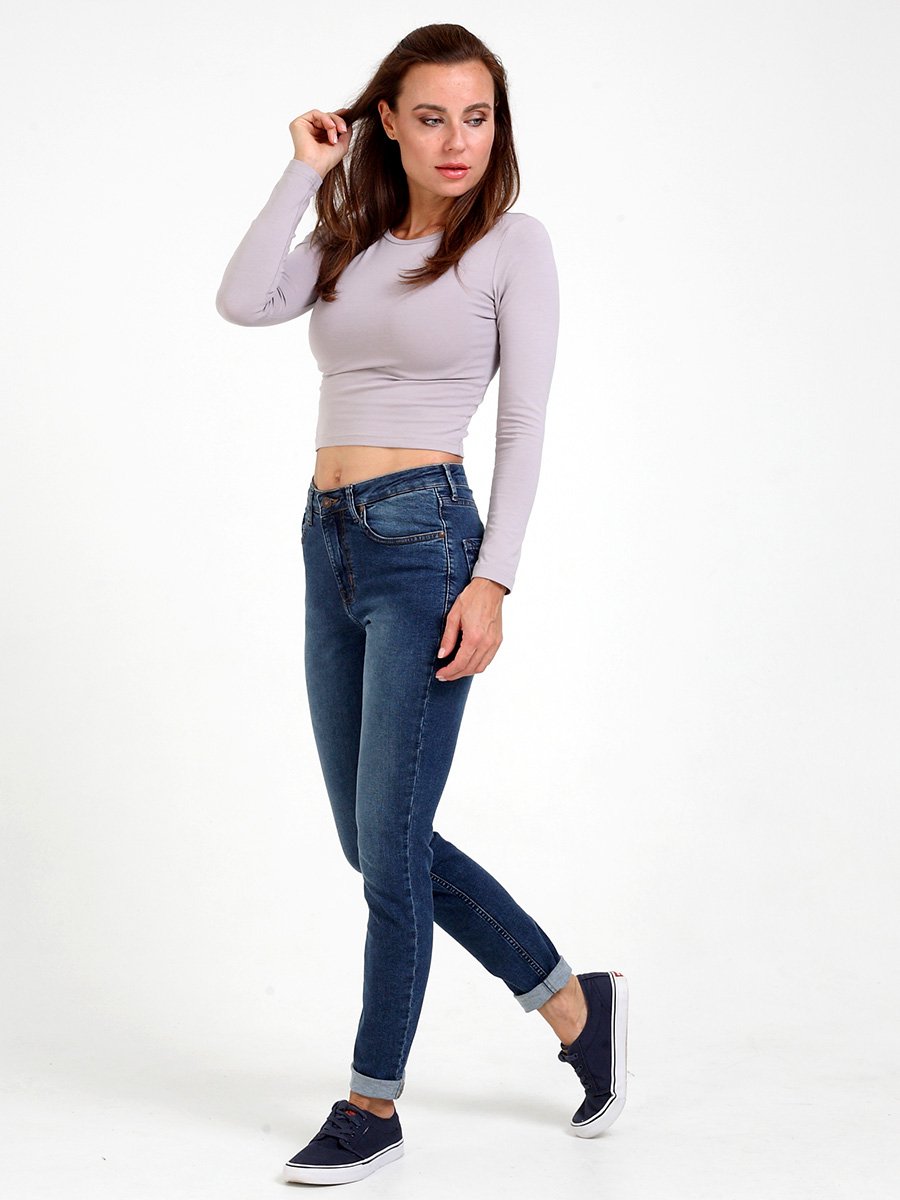 Женские классические джинсы с пятью карманами. Посадка Slim fit. Специально завышенная талия. Для улучшения посадки по талии сделан подкройной пояс из 2-х частей. Застежка на молнии. Узкие по низу. Выполнены из эластичной ткани denim comfort stretch (эластичность 30%). Средняя стирка с потёртостями  спереди и  сзади. Параметры указаны для размера 28. Длина внутреннего шва 77 см.