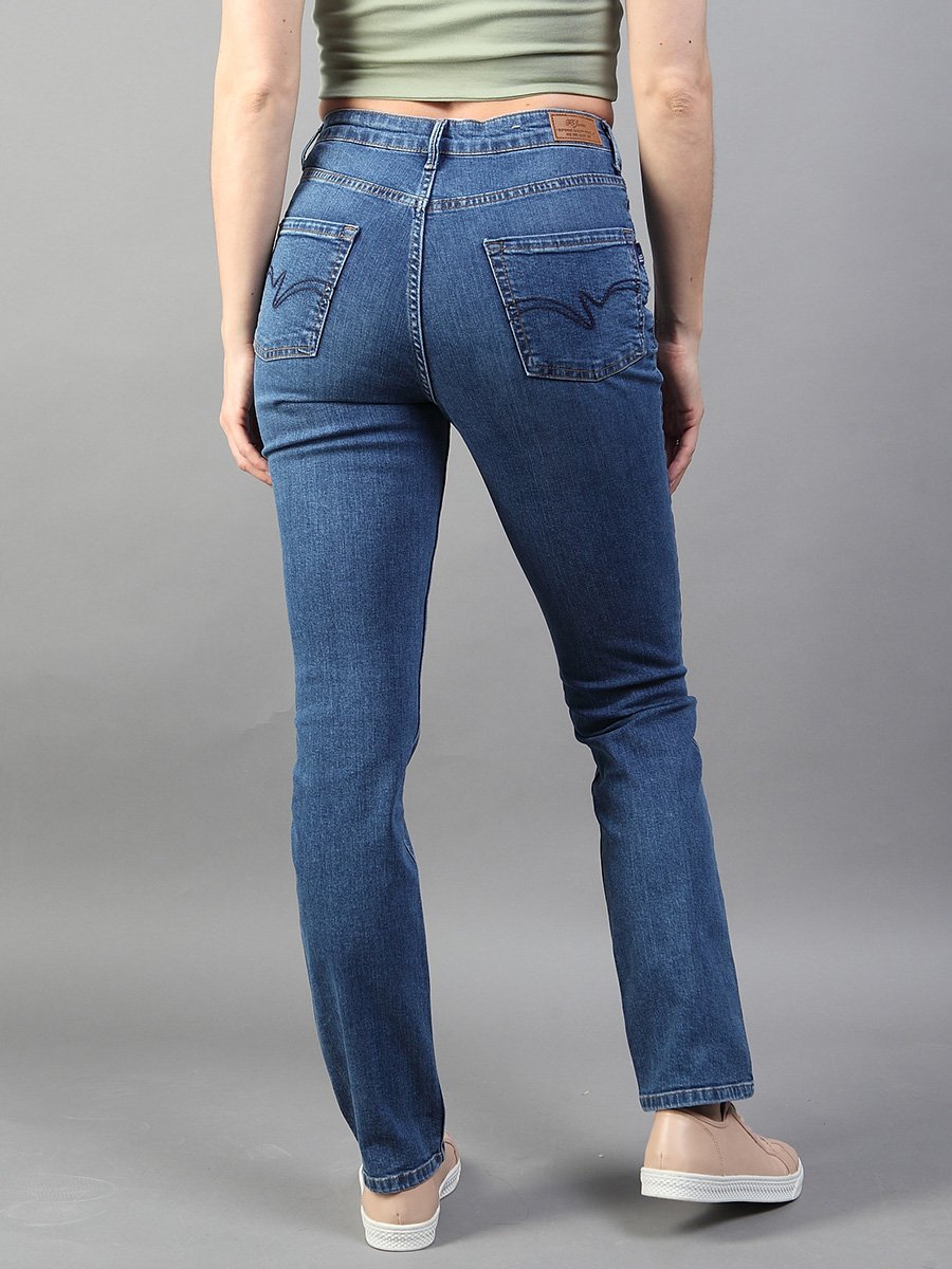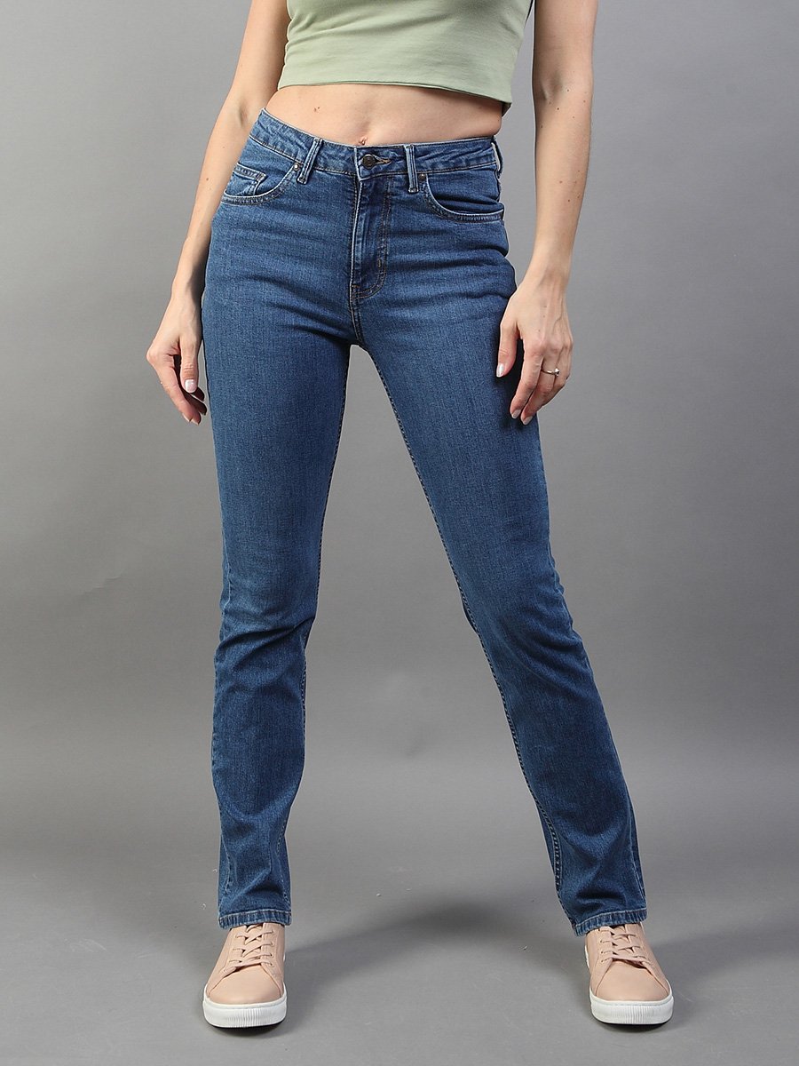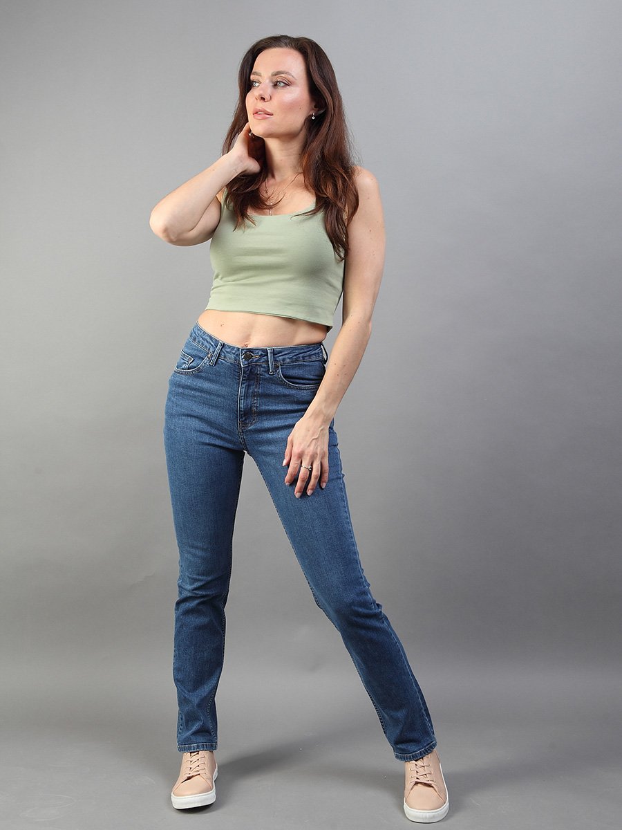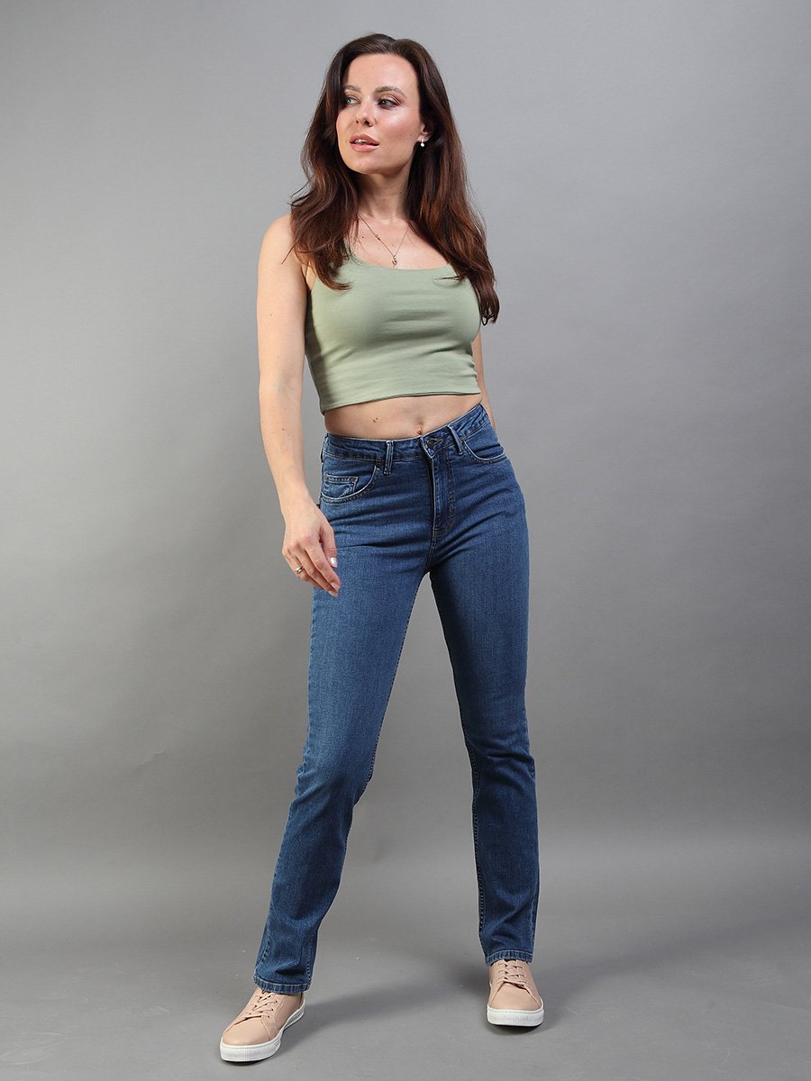Женские классические джинсы с пятью карманами. Посадка Regular fit (полуоблегающие по бедру). Специально завышенная талия. Для улучшения посадки по талии сделан подкройной пояс из 2-х частей. Застежка на молнии. Узкие по низу. Выполнены из  слабоэластичной ткани denim comfort stretch. Средняя стирка с потертостями и слабовыраженными "усами" спереди и потертостями сзади. Параметры указаны для размера 28. Длина внутреннего шва для  роста -79,5 см.