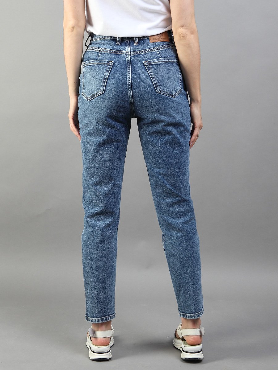 Женские классические ретро джинсы с пятью карманами с использованием лучших традиций 90-х. Посадка Mom fit, высокая талия спереди и сзади, свободные в бедре и зауженные к низу укороченной длины. Застежка на молнии. Выполнены из слабоэластичной ткани denim comfort stretch. Специальная средняя стирка  "towel wash", мраморный эффект.