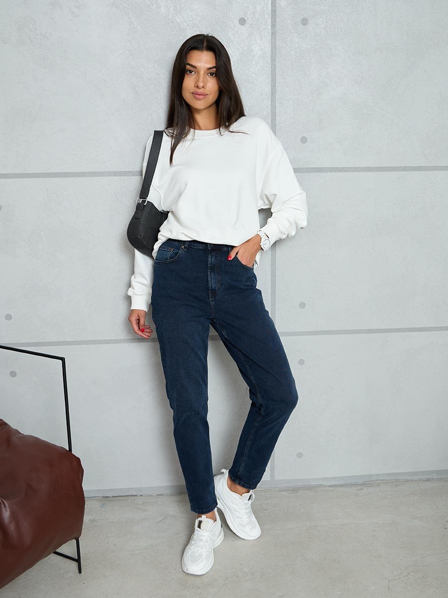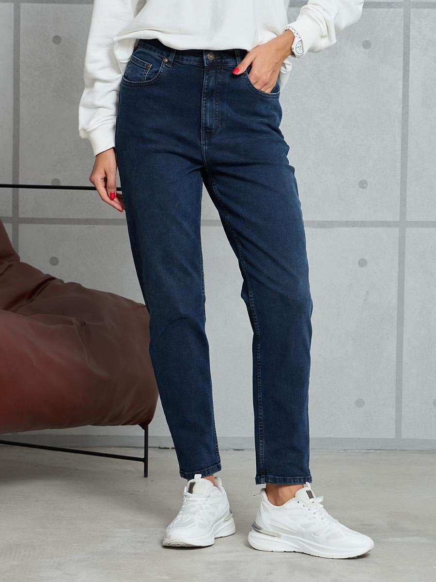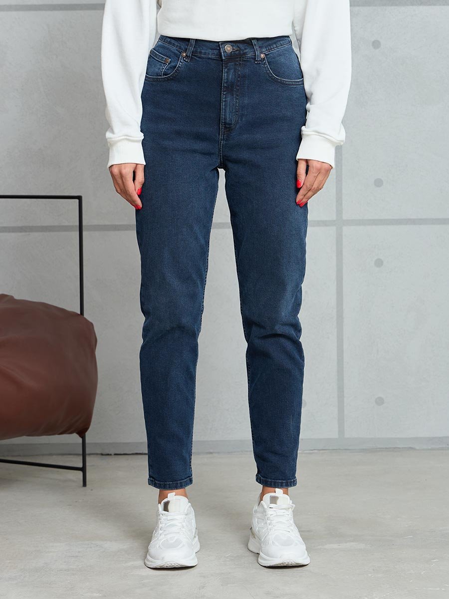 Женские классические ретро джинсы с пятью карманами с использованием лучших традиций 90-х. Посадка Mom fit, высокая талия спереди и сзади, свободные в бедре и зауженные к низу укороченной длины. Застежка на молнии. Выполнены из слабоэластичной ткани denim comfort stretch, цвет ткани Blue/Black(лицевая сторона ткани темно-синяя, изнаночная сторона- черная). Тёмная стирка со слабовыраженными  потёртостями и "усами" спереди и потёртостями сзади.