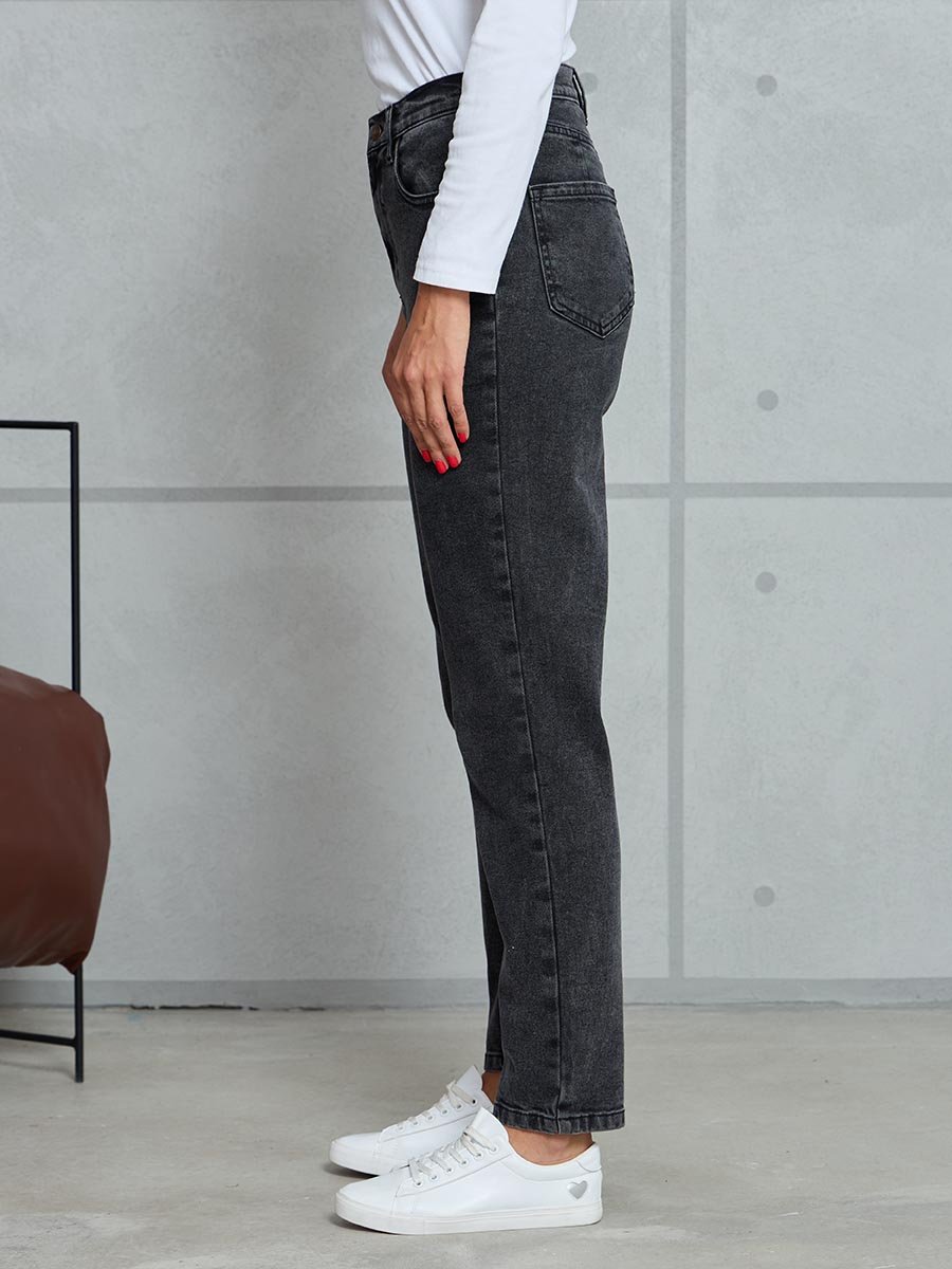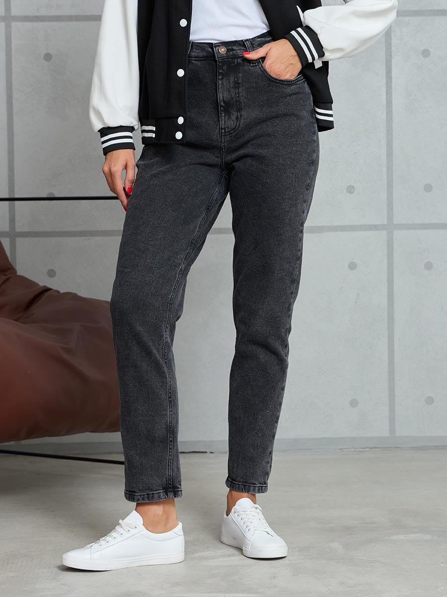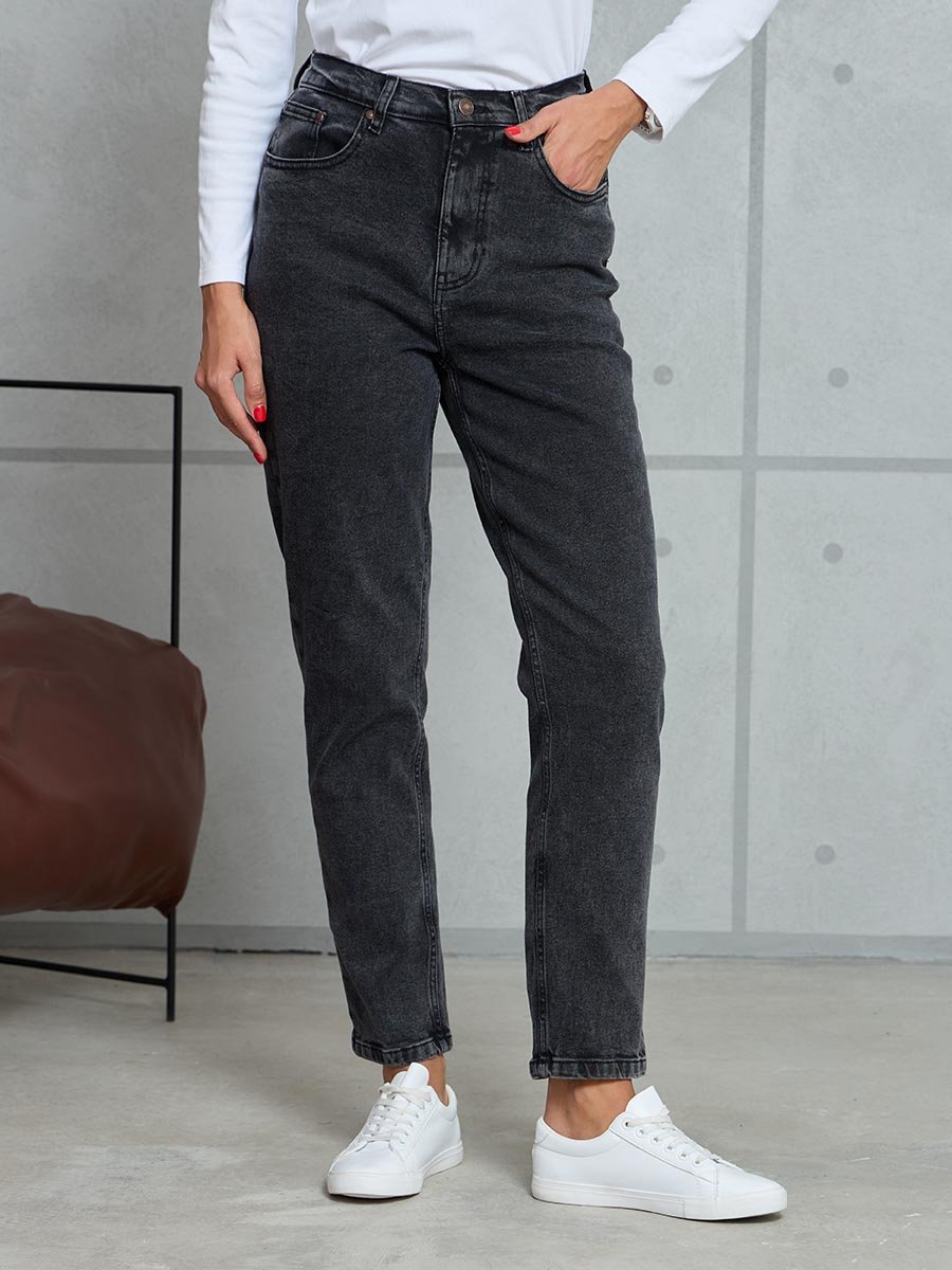 Женские классические ретро джинсы с пятью карманами с использованием лучших традиций 90-х. Посадка Mom fit, высокая талия спереди и сзади, свободные в бедре и зауженные к низу укороченной длины. Застежка на молнии.  Выполнены из слабоэластичной ткани denim comfort stretch, цвет ткани Black/Black (лицевая и изнаночная стороны ткани черные). Специальная темная стирка  "towel wash", мраморный эффект.