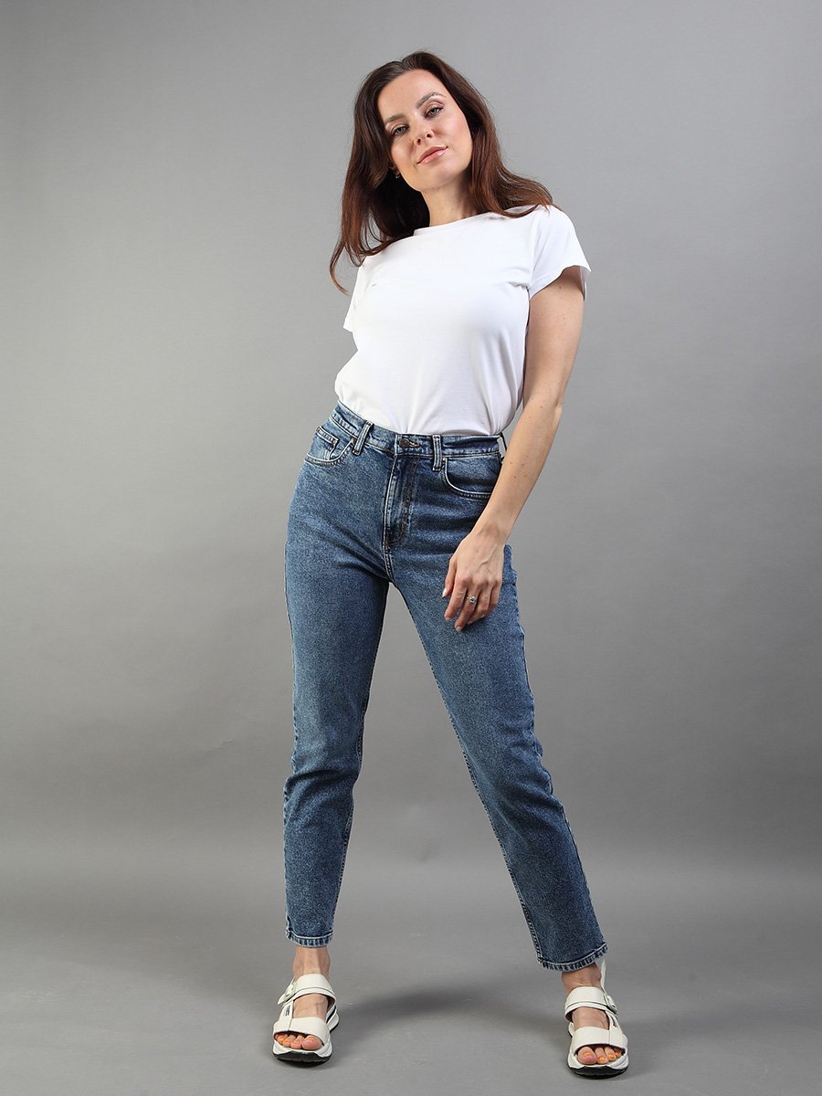 Женские классические ретро джинсы с пятью карманами с использованием лучших традиций 90-х. Посадка Mom fit, высокая талия спереди и сзади, свободные в бедре и зауженные к низу укороченной длины. Застежка на молнии. Выполнены из слабоэластичной ткани denim comfort stretch. Специальная средняя стирка  "towel wash", мраморный эффект.