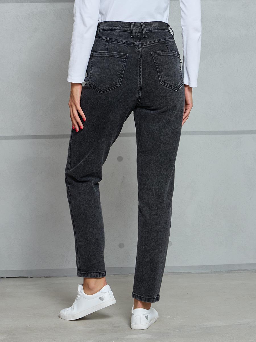 Женские классические ретро джинсы с пятью карманами с использованием лучших традиций 90-х. Посадка Mom fit, высокая талия спереди и сзади, свободные в бедре и зауженные к низу укороченной длины. Застежка на молнии.  Выполнены из слабоэластичной ткани denim comfort stretch, цвет ткани Black/Black (лицевая и изнаночная стороны ткани черные). Специальная темная стирка  "towel wash", мраморный эффект.