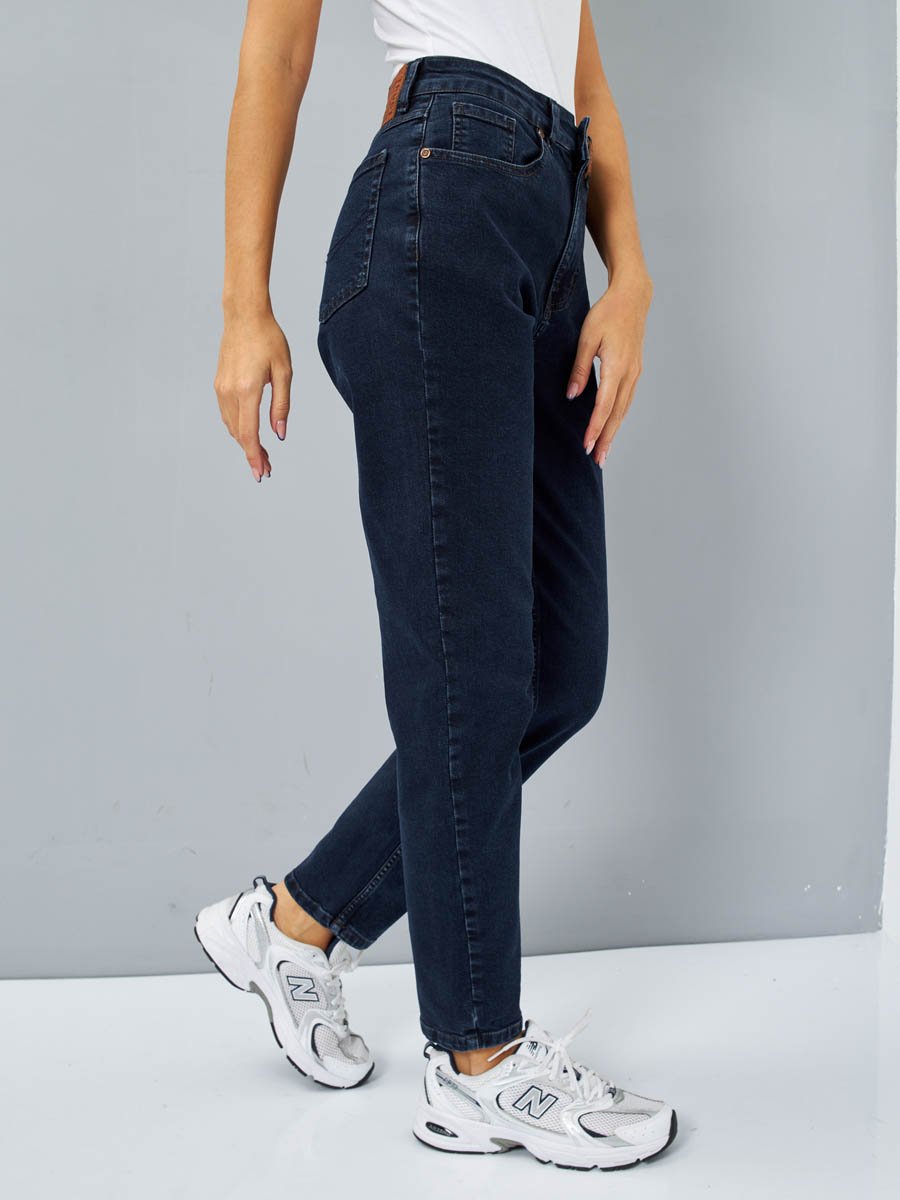 Женские модные джинсы с пятью карманами. Посадка Mom fit (высокая талия), свободные в бедре и зауженные к низу, укороченной длины.  Застежка на молнию. Выполнены из слабоэластичной ткани denim comfort stretch, цвет ткани Blue/Black(лицевая сторона ткани темно-синяя, изнаночная сторона-черная). Темная стирка "stone wash".