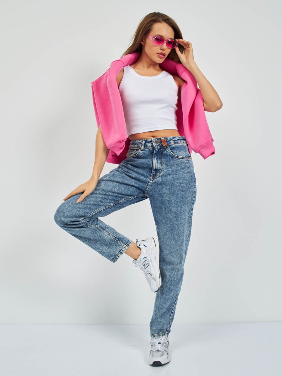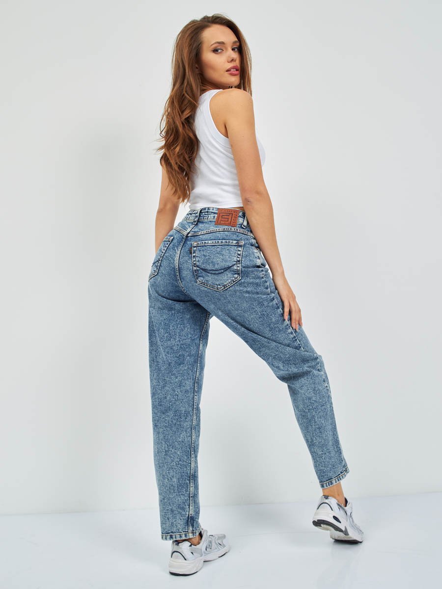 Женские модные джинсы с пятью карманами. Посадка Mom fit (высокая талия), свободные в бедре и зауженные к низу, укороченной длины. Застежка на молнию. Выполнены из слабоэластичной ткани denim comfort stretch. Специальная средняя стирка с "towel wash" со слабовыраженными потёртостями и "усами" спереди и потёртостями сзади. Джинсы дополнительно чуть-чуть подкрашены в желтый цвет для получения эффекта "GET DIRTY", т.е. эффекта запачканных джинсов.