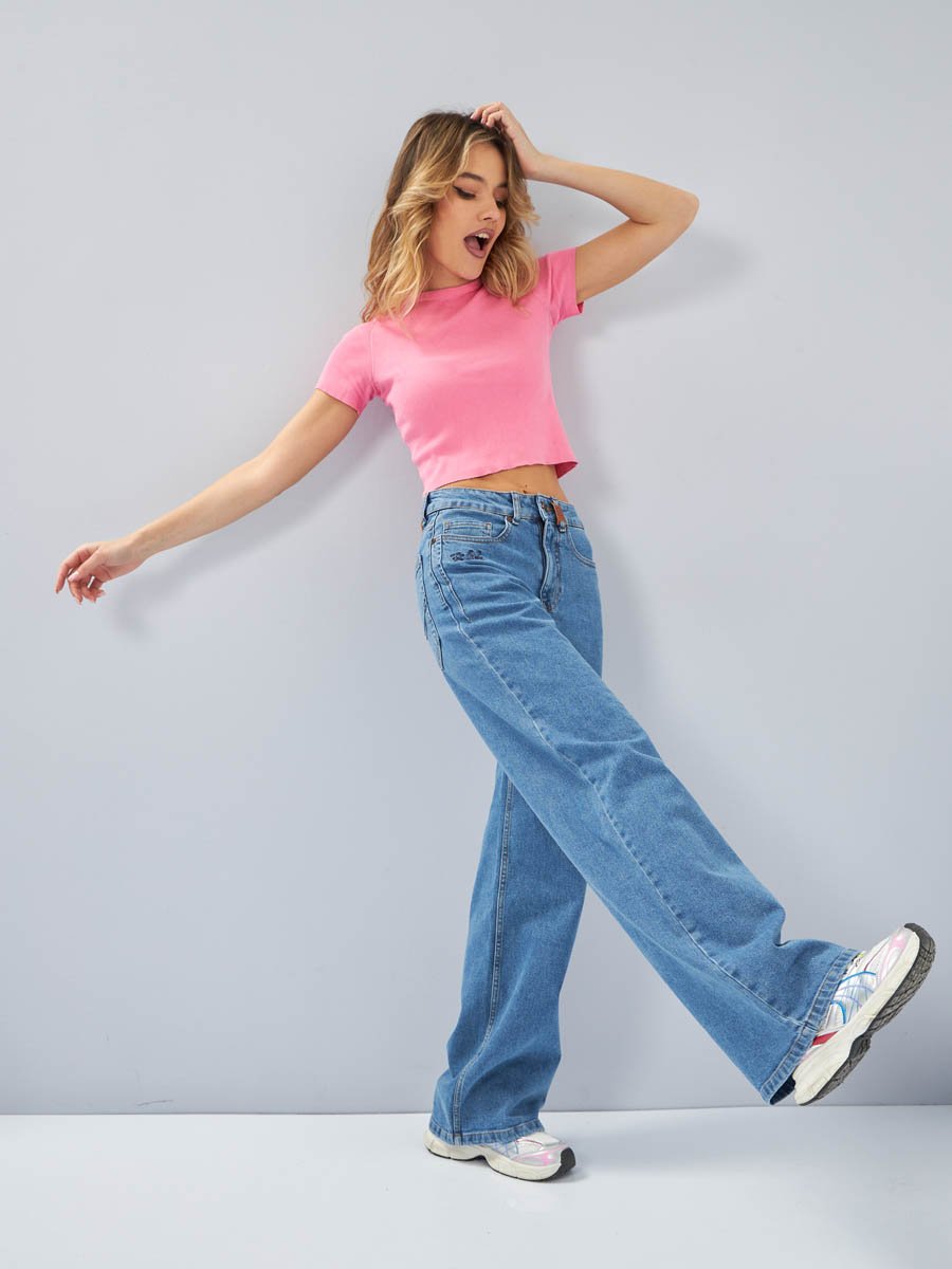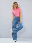 Женские модные джинсы с пятью карманами. Посадка Baggy fit , высокая талия спереди и сзади, широкие штанины  по всей длине. Для лучшего облегания в области бедер под передними карманами сделана вытачка. Застежка на молнии. Выполнены из слабоэластичной ткани denim comfort stretch. Средня стирка "stone wash".