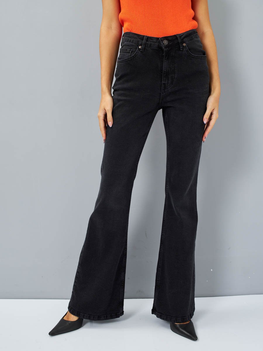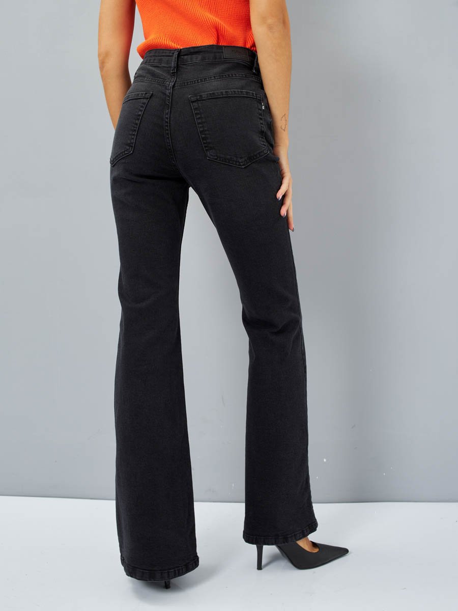 Женские джинсы с пятью карманами. Посадка Slim flare fit (облегающие по бедру и расклешенные от колена), высокая талия. Для улучшения посадки по талии сделан подкройной пояс из 2-х частей. Застежка на молнии. Выполнены из сдабоэластичной ткани denim stretch, цвет ткани Black/Black (лицевая и изнаночная стороны ткани черные). Классическая темная стирка со слабовидимыми потертостями спереди и сзади.