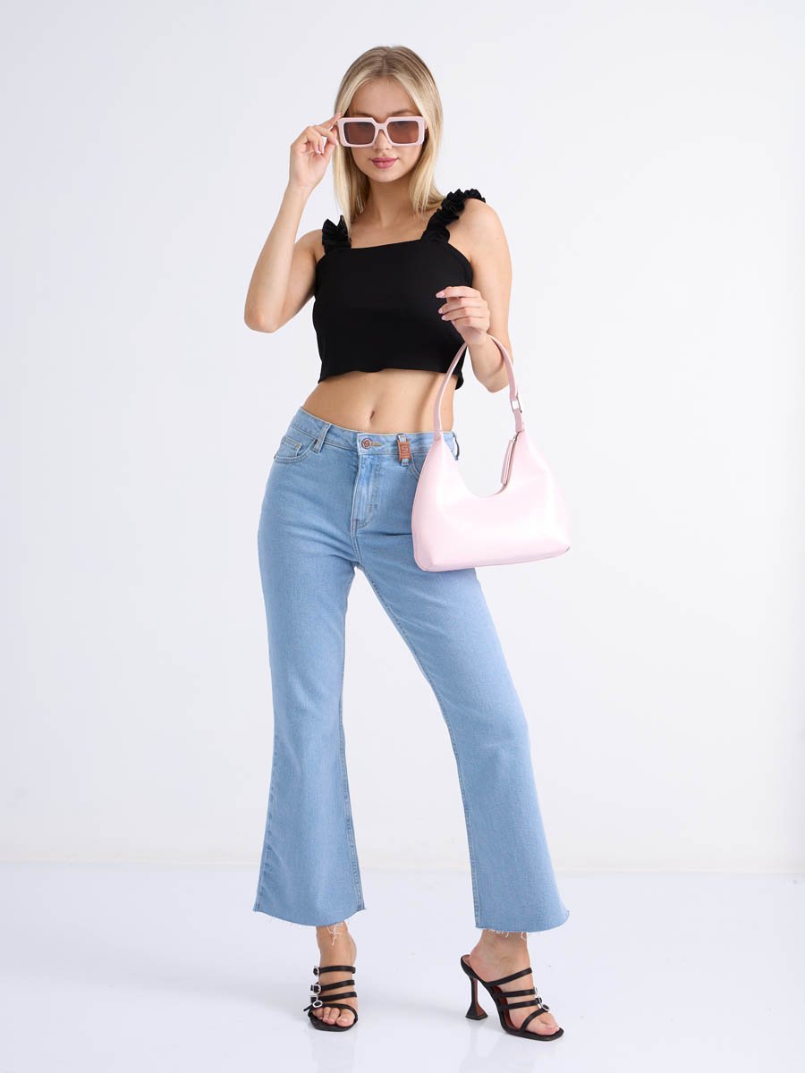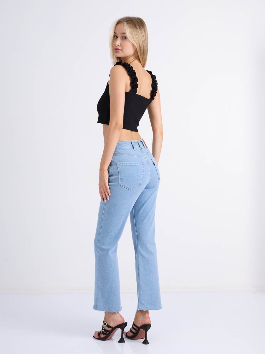 Женские джинсы с пятью карманами. Посадка Flare fit (полуоблегающие по бедру и расклешенные от колена), высокая талия, укороченной длины. Для улучшения посадки по талии сделан подкройной пояс из 2-х частей. Застежка на молнии. Выполнены из слабоэластичной ткани denim stretch. Классическая светлая стирка "stone wash"с  отбеливанием.