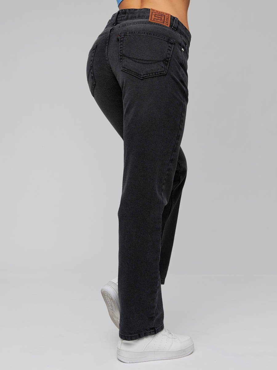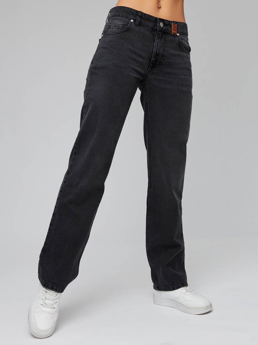 Женские классические джинсы с пятью карманами. Посадка Comfort fit (свободные по бедру). Средняя высота талии спереди и умеренно-высокая сзади. Застежка на молнии. Свободные  по всей длине штанины, немного зауженные  к  низу. Выполнены из традиционной хлопковой  ткани denim, цвет ткани Black/Black (лицевая и изнаночная стороны ткани черные). Темная стирка "stone wash".