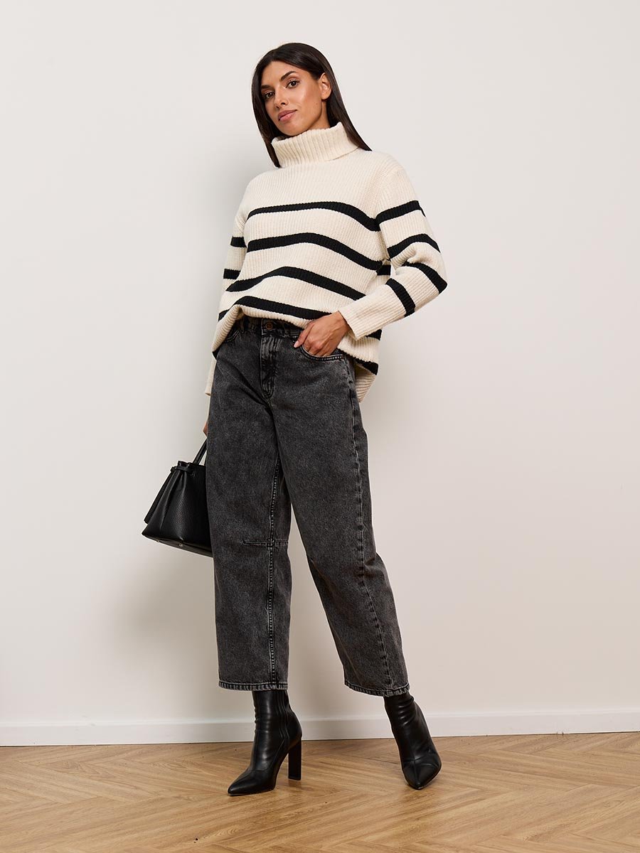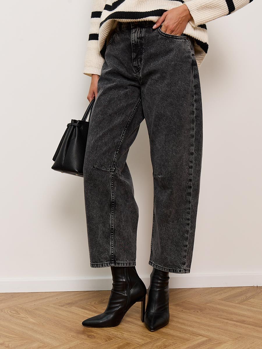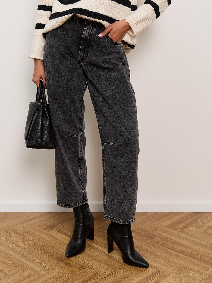 Джинсы Barrel (Бочка) - тренд сезона! Укороченные джинсы модного кроя Barrel с вытачками на коленях создают идеальный объемный силуэт "бочонка" - широкие в бедрах и плавно сужающиеся к низу. Это создает современный и очень стильный геометрический образ. Вытачки в области колена  по внутреннему шву не просто являются дизайнерской изюминкой, но и дополнительно подчеркивают  требуемый силуэт бочонка и обеспечивают идеальную посадку по ноге, сохраняя форму джинсов при движении. Укороченная длина "анкл" (ankle-length) визуально делает образ легче и современнее и идеально подходит для создания настроения легкой небрежности.  Изготовлены из черного денима. Специальная стирка towel wash позволяет получить особый винтажный вид ткани с легким мраморным эффектом. Эта  модель - идеальная пара для современных стильных и смелых образов.