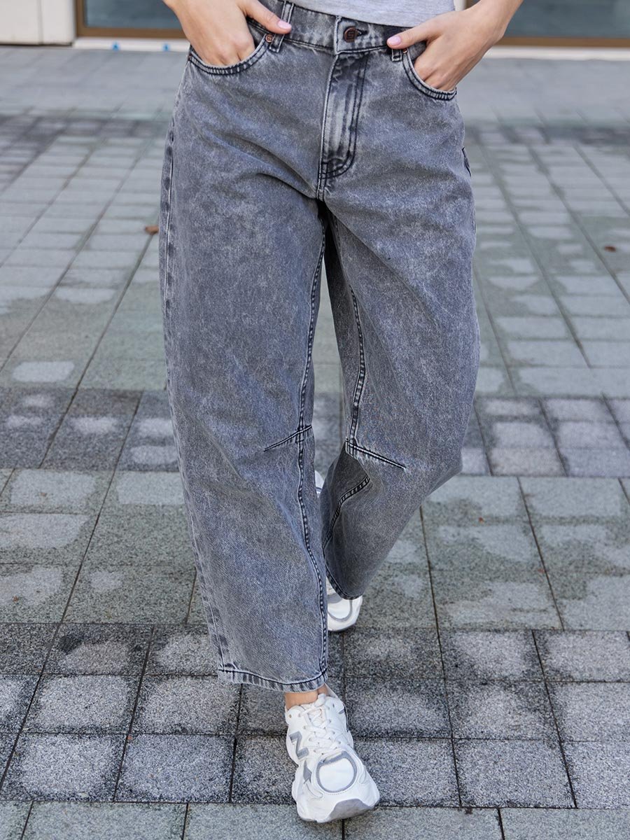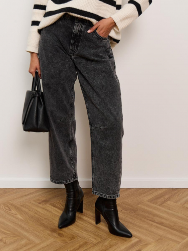 Джинсы Barrel (Бочка) - тренд сезона! Укороченные джинсы модного кроя Barrel с вытачками на коленях создают идеальный объемный силуэт "бочонка" - широкие в бедрах и плавно сужающиеся к низу. Это создает современный и очень стильный геометрический образ. Вытачки в области колена по внутреннему шву не просто являются дизайнерской изюминкой, но и дополнительно подчеркивают требуемый силуэт бочонка и обеспечивают идеальную посадку по ноге, сохраняя форму джинсов при движении. Укороченная длина "анкл" (ankle-length) визуально делает образ легче и современнее и идеально подходит для  создания настроения легкой небрежности. Изготовлены из черного денима. Специальная стирка towel wash позволяет получить особый винтажный вид ткани с легким мраморным эффектом. Эта  модель - идеальная пара для современных стильных и смелых образов.