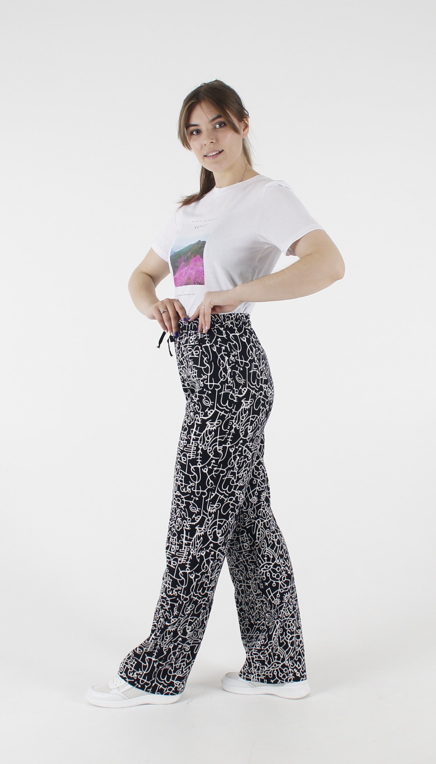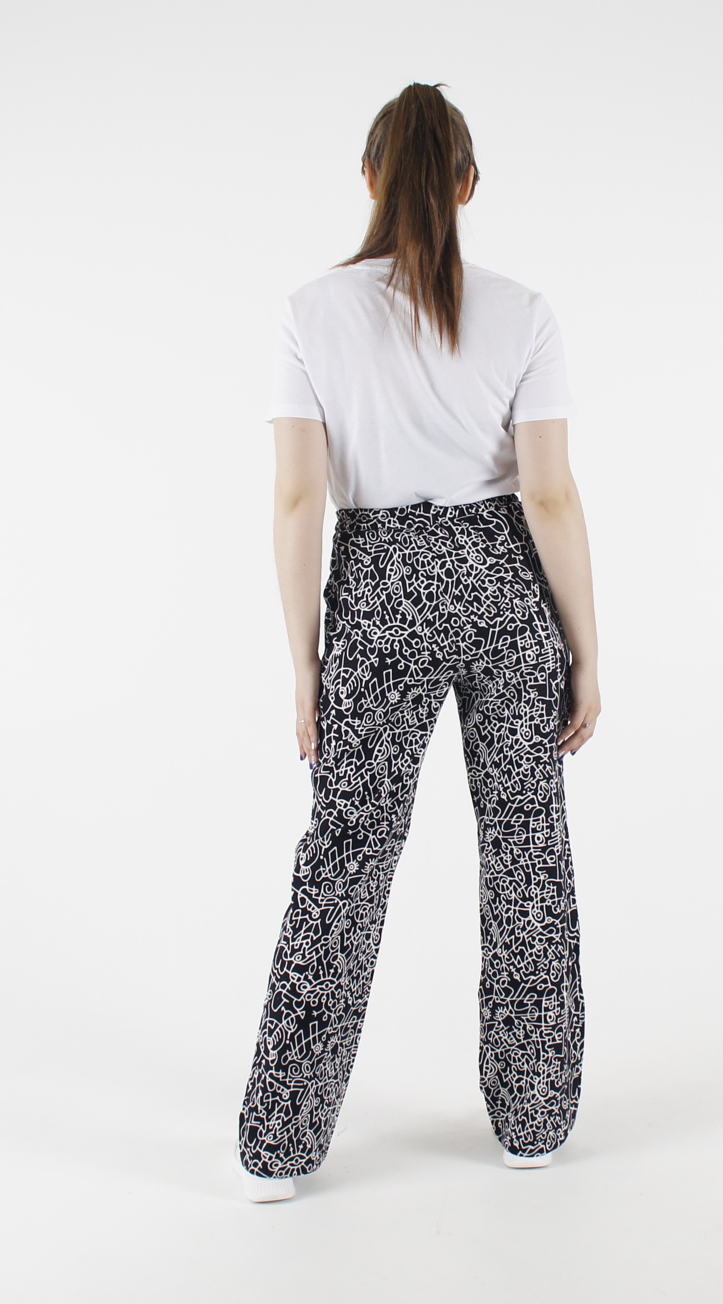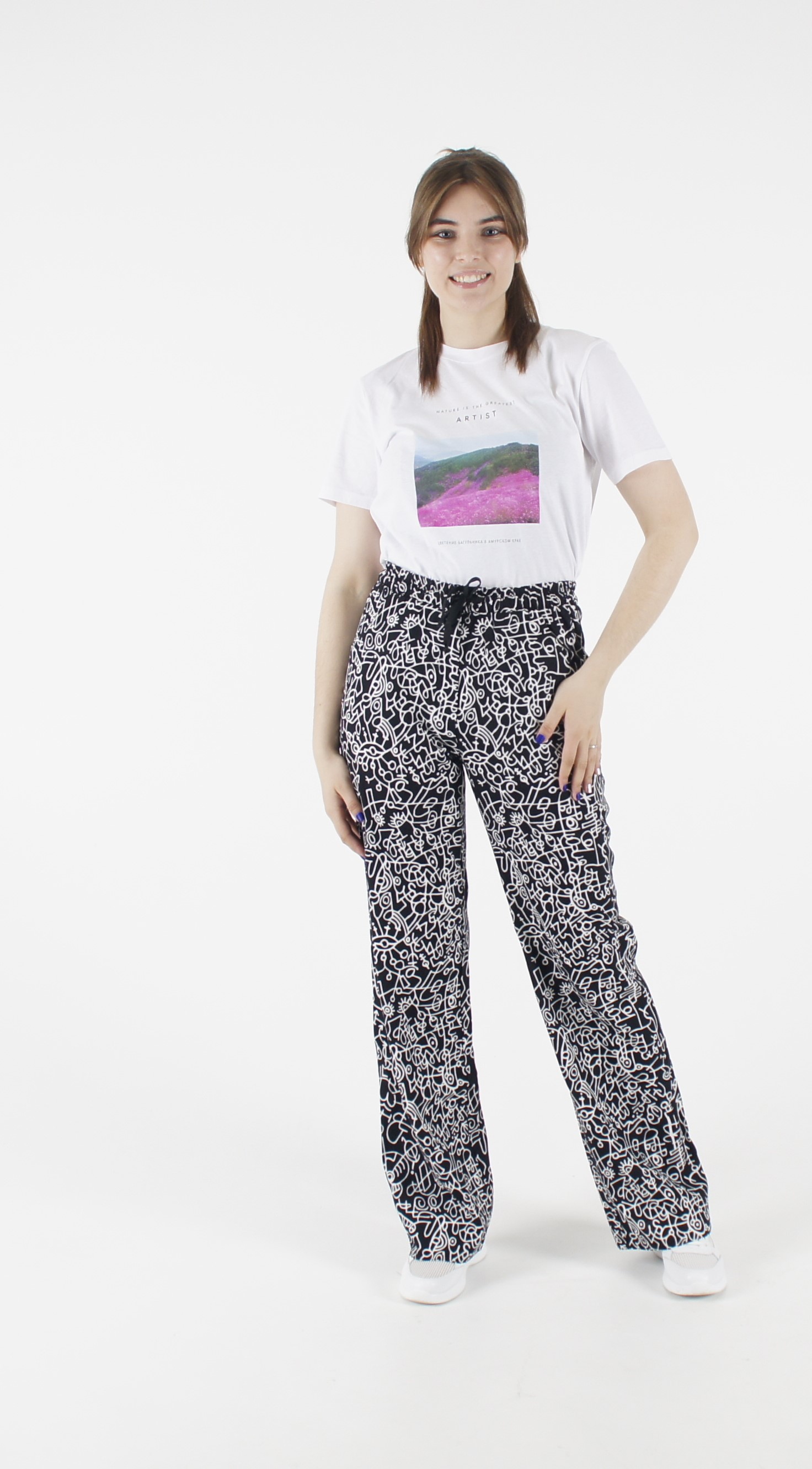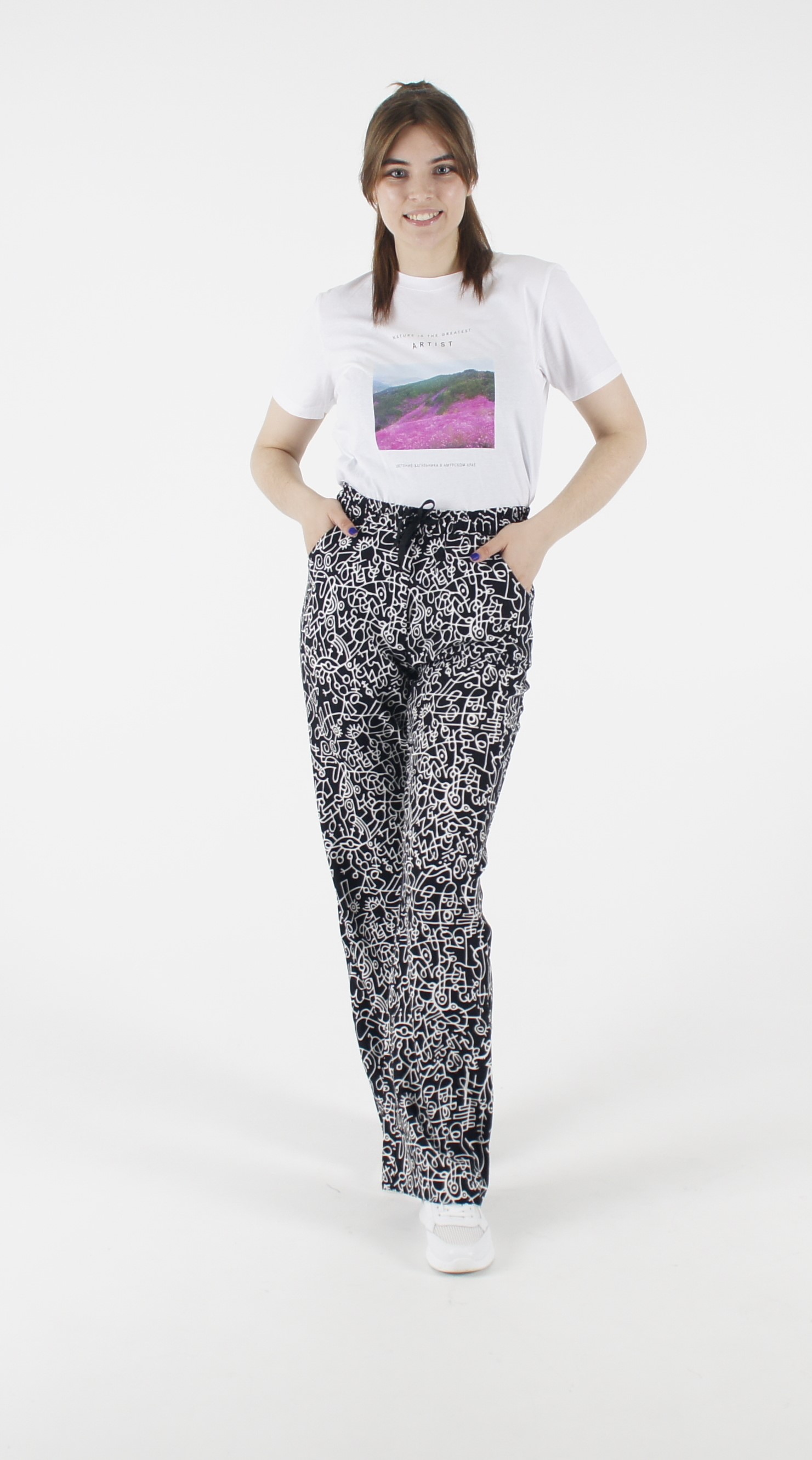 Брюки из хлопка, цвет черный с белым рисунком.Прямого силуэта с передними карманами.Пояс на резинке, со шнурком.Длина 105 см.Состав: Хлопок 95%, Эластан 5%