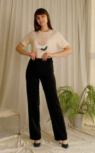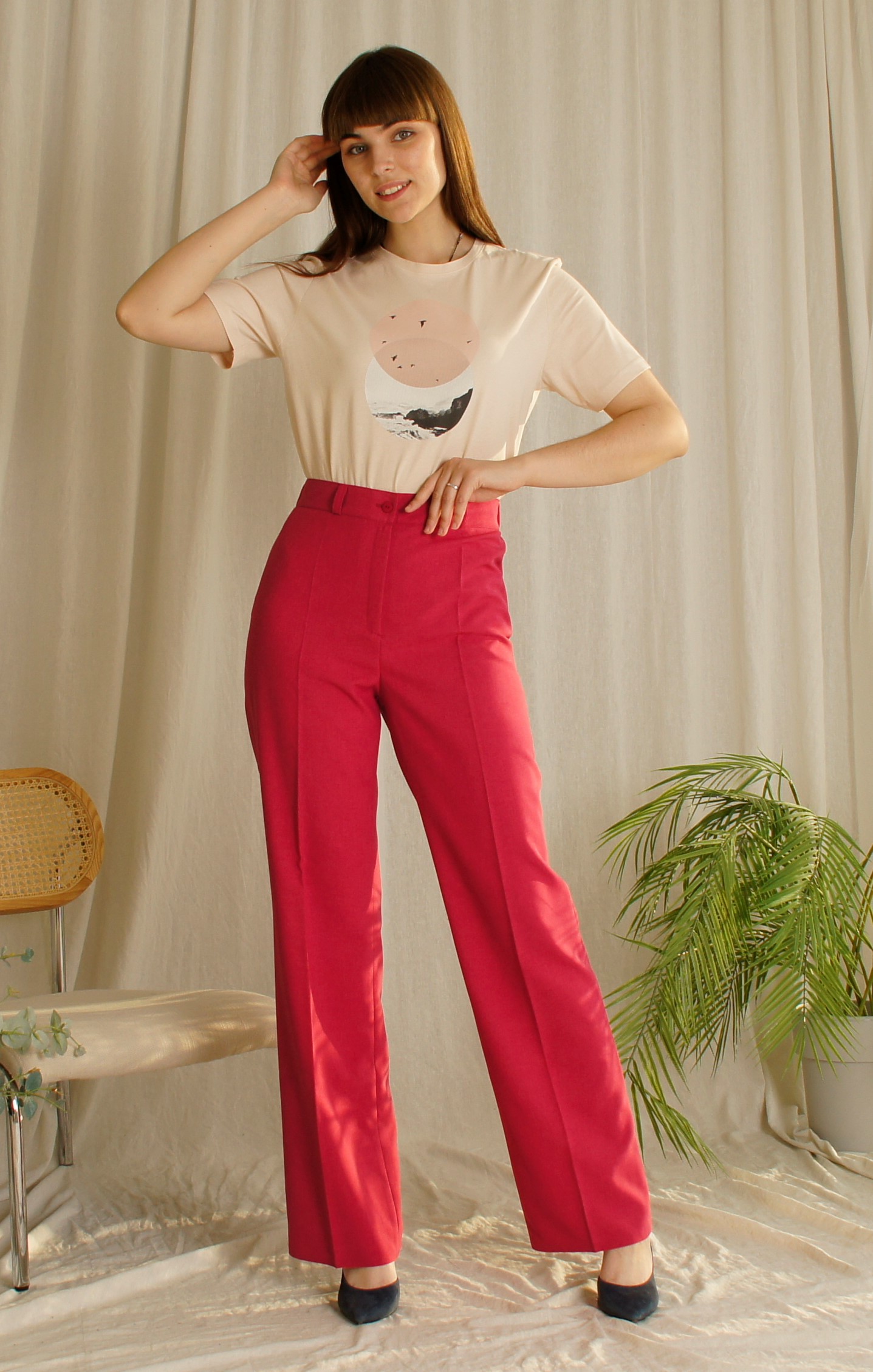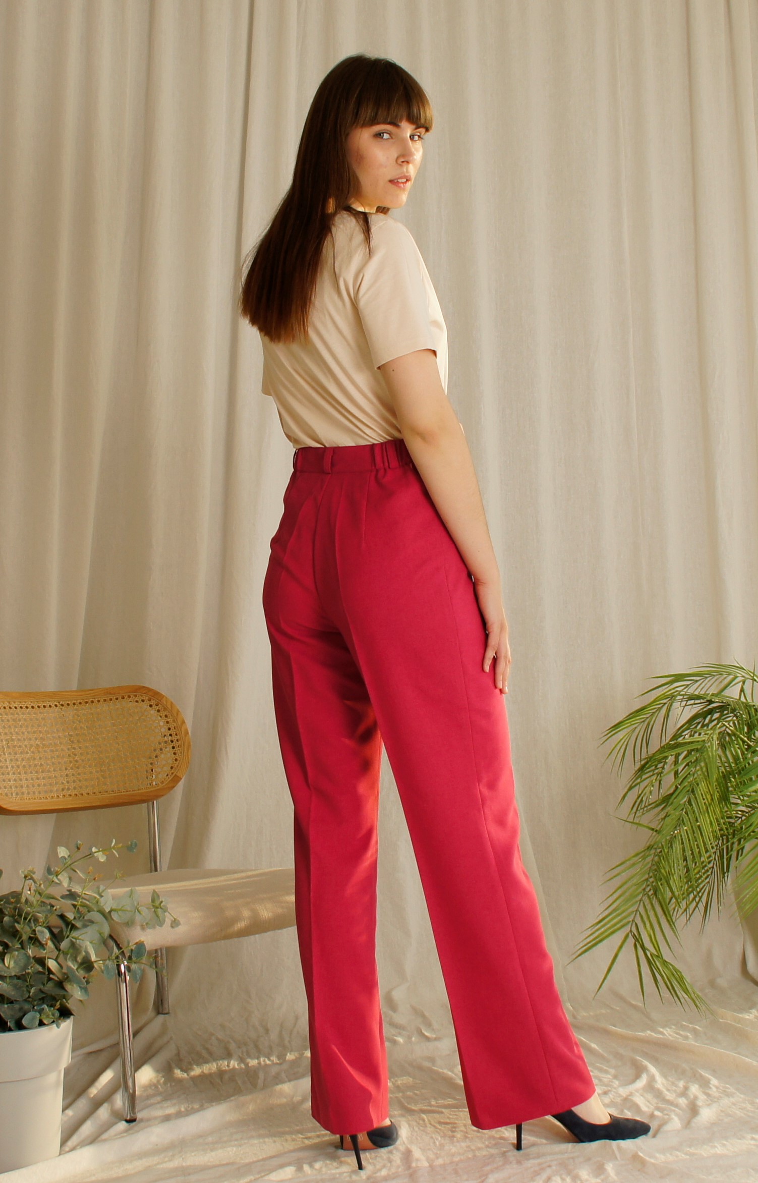 Брюки-трубы прямого покроя, с высокой посадкой, на поясе, с застежкой на молнии и пуговке.На поясе шлевки.Пояс по бокам с резиночками.Длина по боковому шву108 см, по внутреннему 85 см и ширина внизу 26 см.(Замеры проведены по 50 размеру) Состав 70% лён , 30% полиэстер.Цвет малиновый.