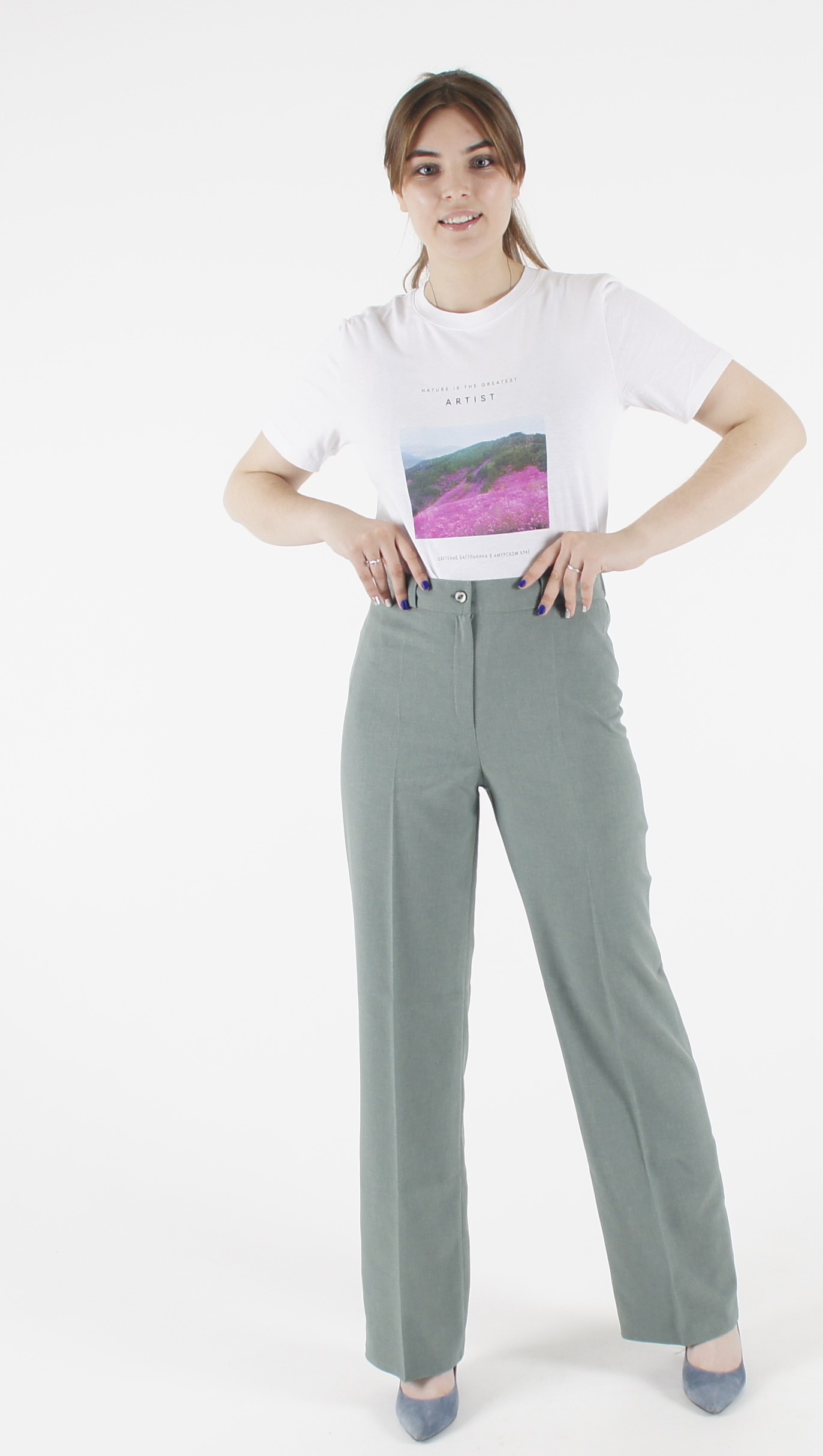 Брюки-трубы прямого покроя, с высокой посадкой, на поясе, с застежкой на молнии и пуговке.На поясе шлевки.Пояс по бокам с резиночками.Длина по боковому шву108 см, по внутреннему 85 см и ширина внизу 26 см.(Замеры проведены по 50 размеру) Состав 70% лён , 30% полиэстер.Цвет олива.