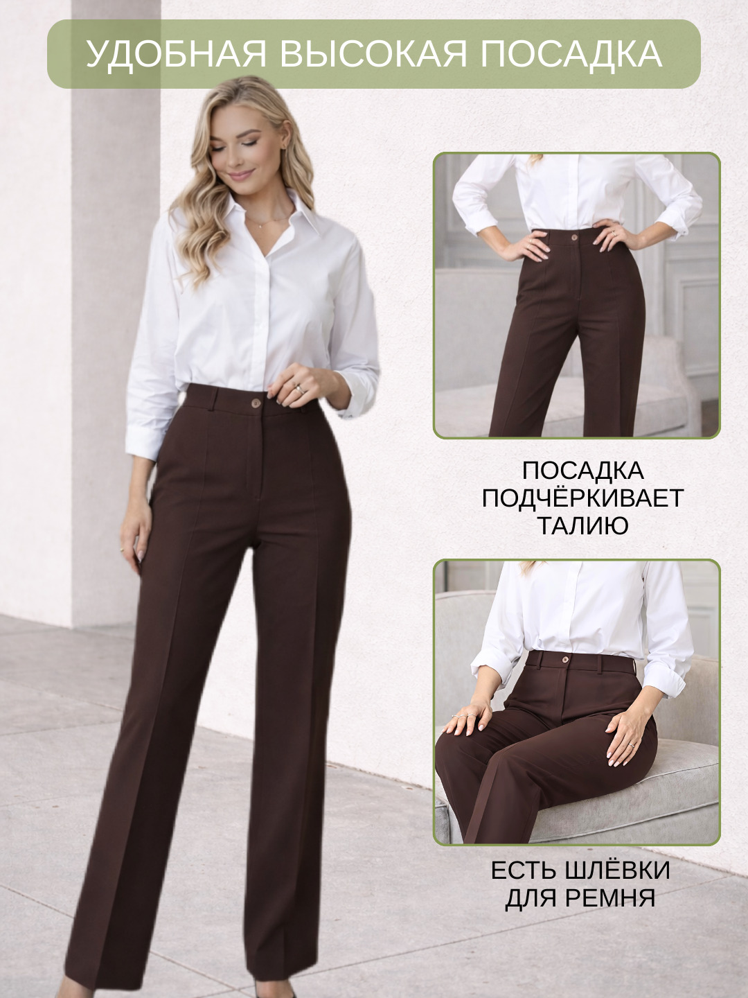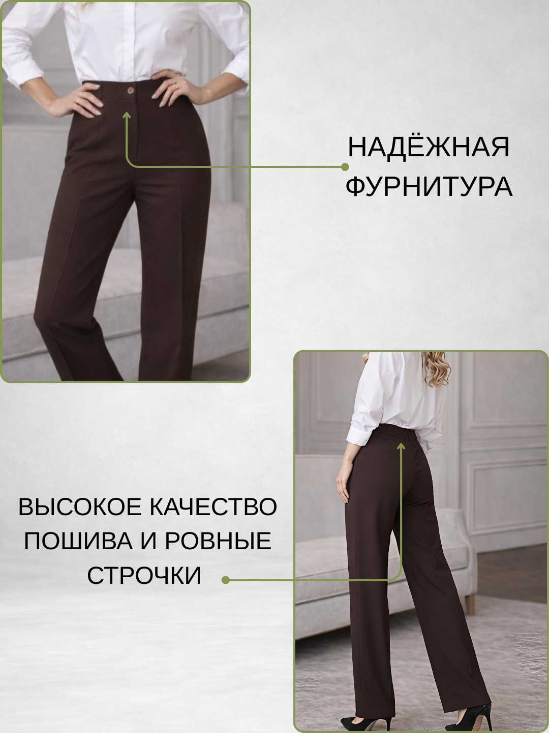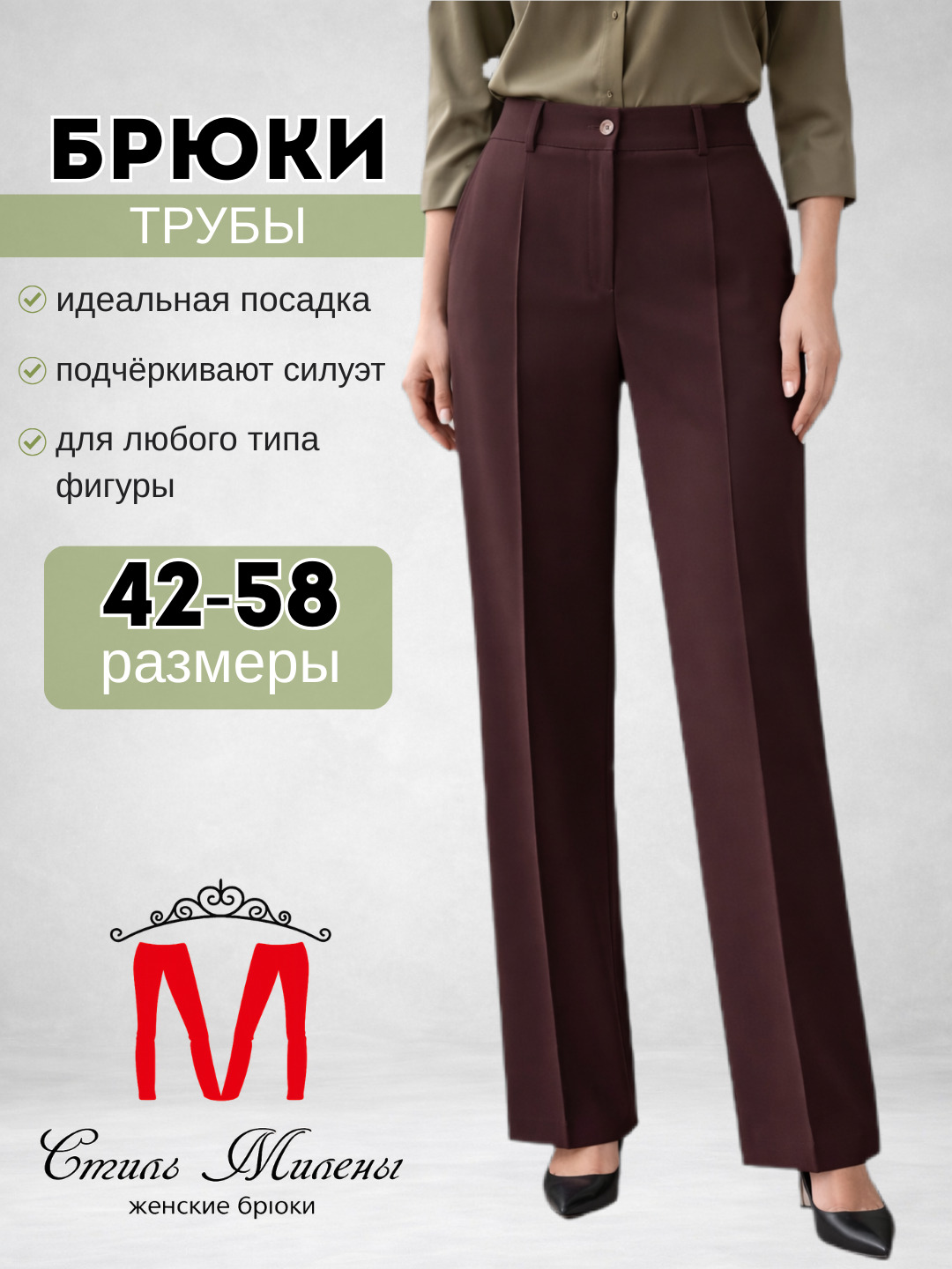 Брюки прямого покроя на поясе, сбоку резинка, застежка на молнию и пуговку.Длина по боковому шву 108 см. Состав: Вискоза 95%, Эластан 5%.