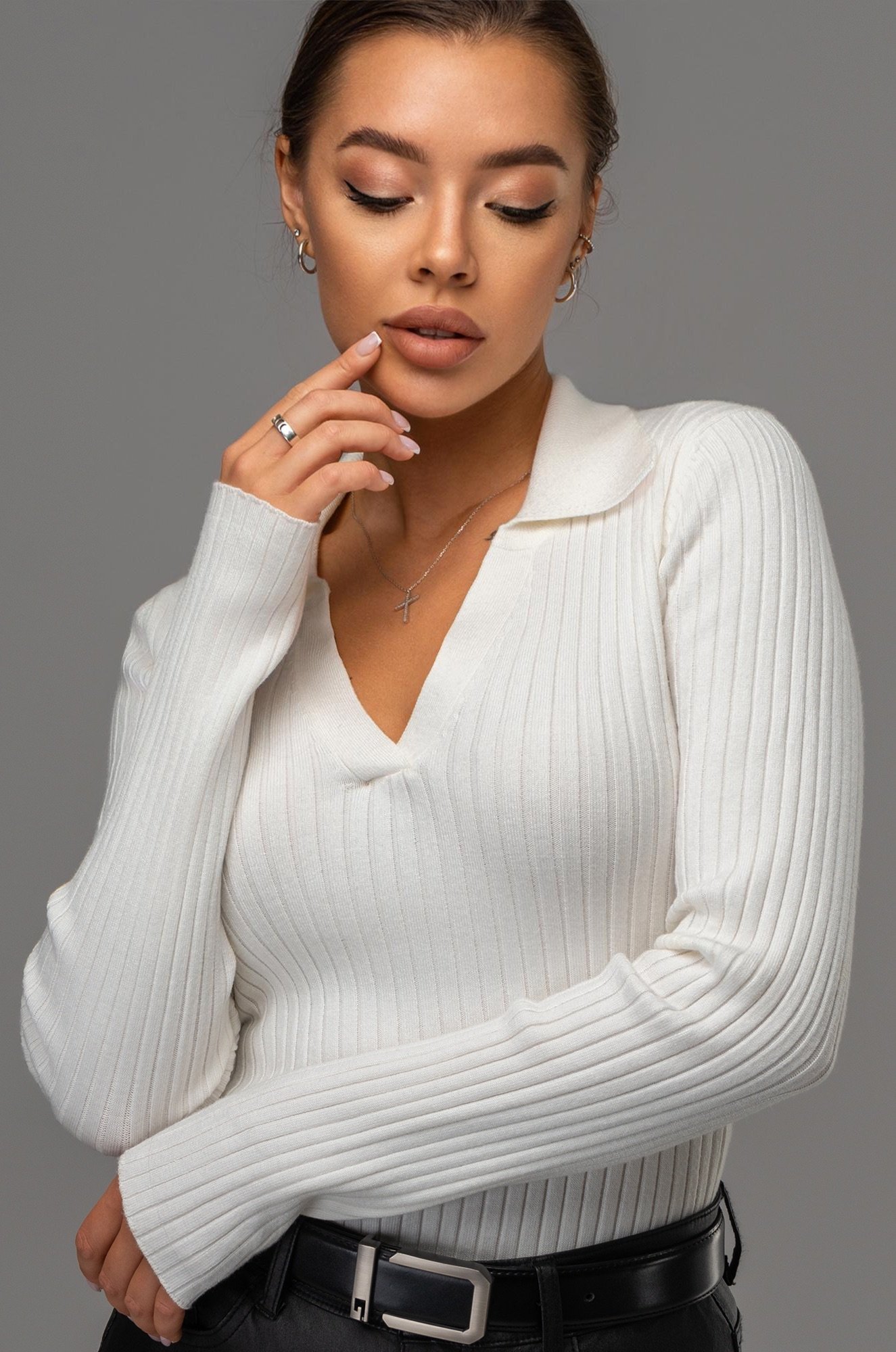 Женский джемпер с V-образным вырезом – универсальный выбор на осень и весну. Базовый вязаный джемпер в рубчик станет незаменимой частью гардероба в демисезонный период. Однотонный пуловер с отложным воротником поможет создать стильные образы для работы в офисе и повседневных прогулок.