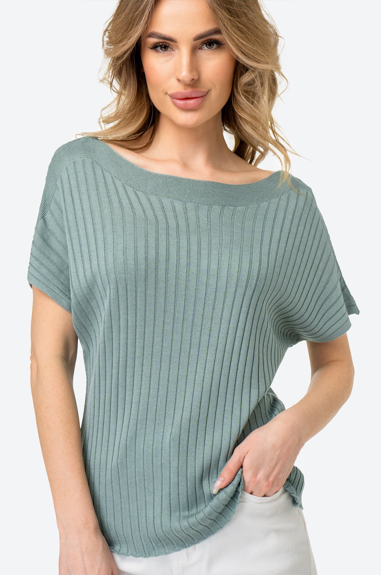 Сама нежность и элегантность! Женский джемпер из вязаного трикотажа выполнен фактурной вязкой лапша и представлен в ментоловом цвете. Летняя модель прямого силуэта со спущенным плечом имеет свободную посадку. Вырез лодочка красиво открывает шею и подчеркивает линию ключиц.
