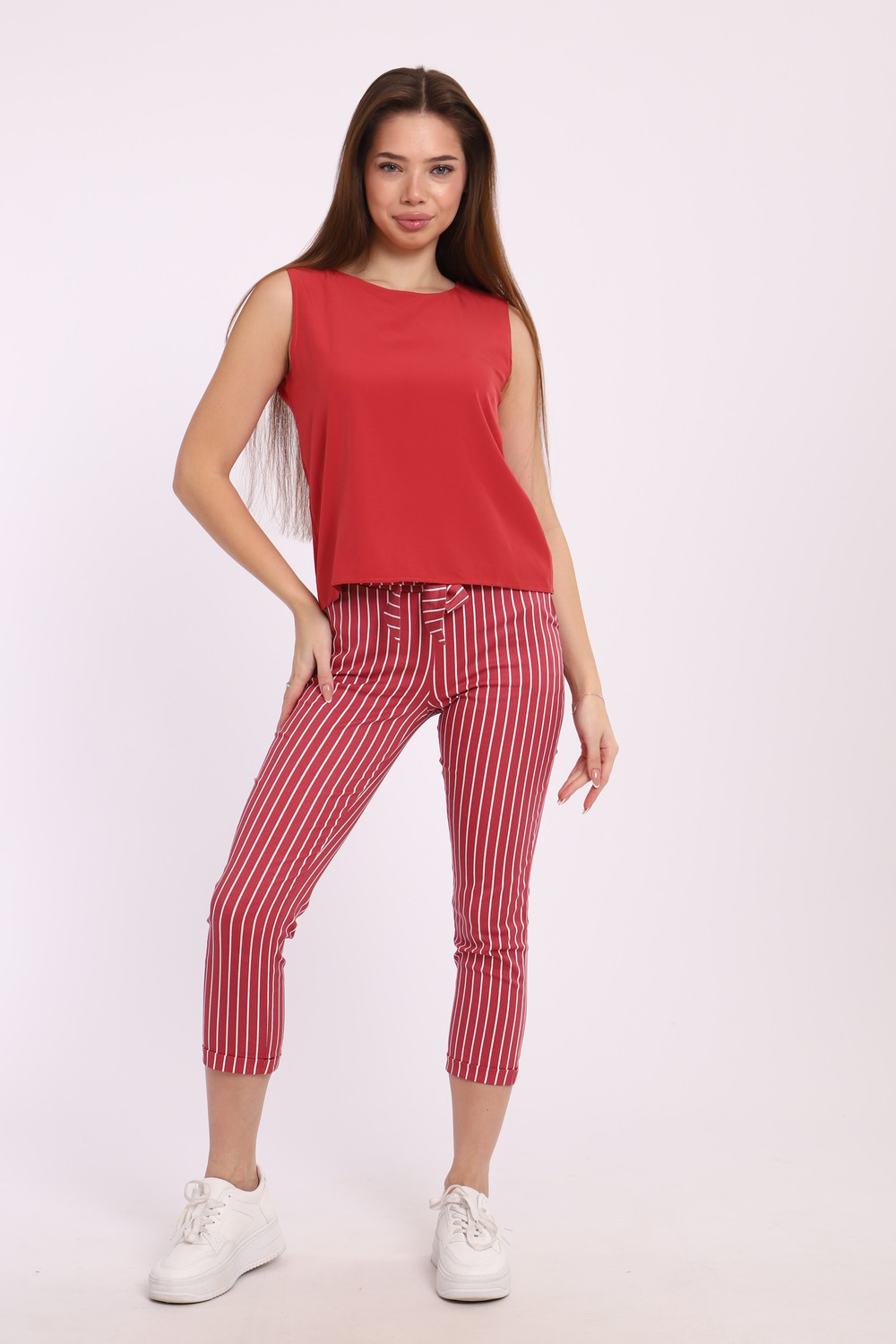 Наш однотонный топ, входящий в комплект, создан для того, чтобы гармонично дополнять полосатые брюки. Этот элемент гардероба выполнен в классическом дизайне, что позволяет легко сочетать его как с другими частями вашего гардероба, так и с различными аксессуарами. Материал топа мягкий и приятный к телу, он отлично сохраняет форму и не теряет цвет после множества стирок.