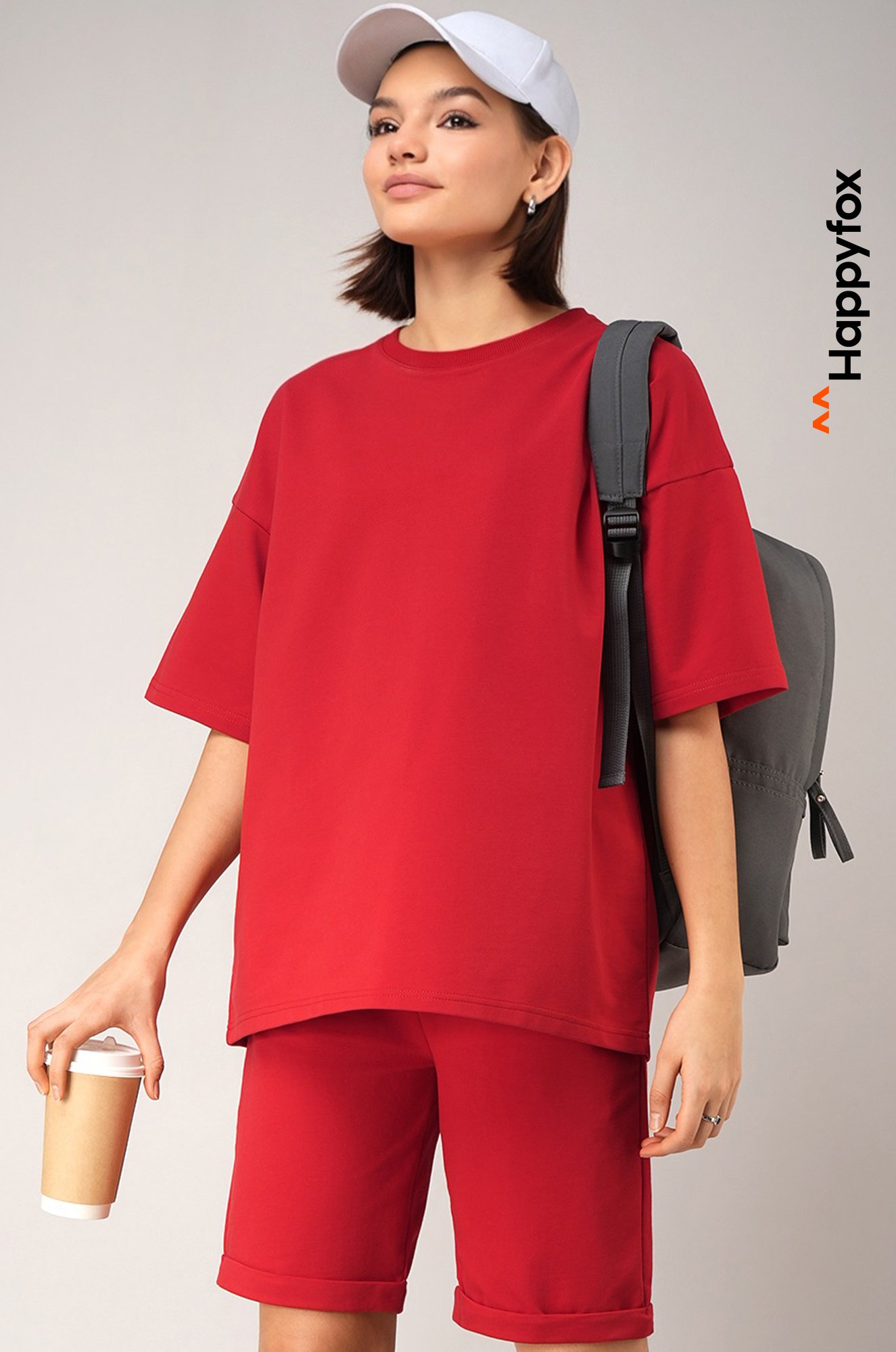 Женский костюм в красном цвете — сама грация и комфорт! Однотонный спортивный костюм оверсайз с удлиненной футболкой и практичными шортами дарит полную свободу движений. Летний комплект двойка выполнен из мягкого трикотажного футера с высоким содержанием хлопка.