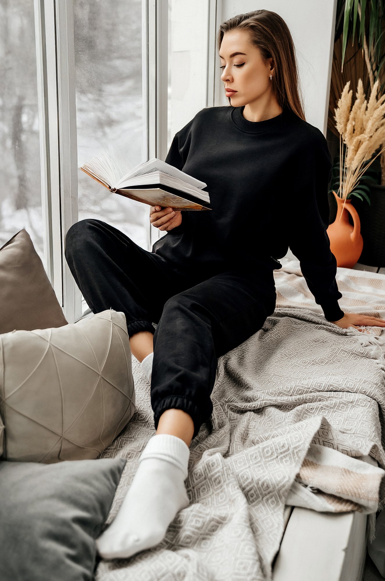 Женский спортивный костюм оверсайз станет надежным спутником на тренировках и в повседневной жизни. Демисезонный черный костюм двойка состоит из толстовки и брюк.