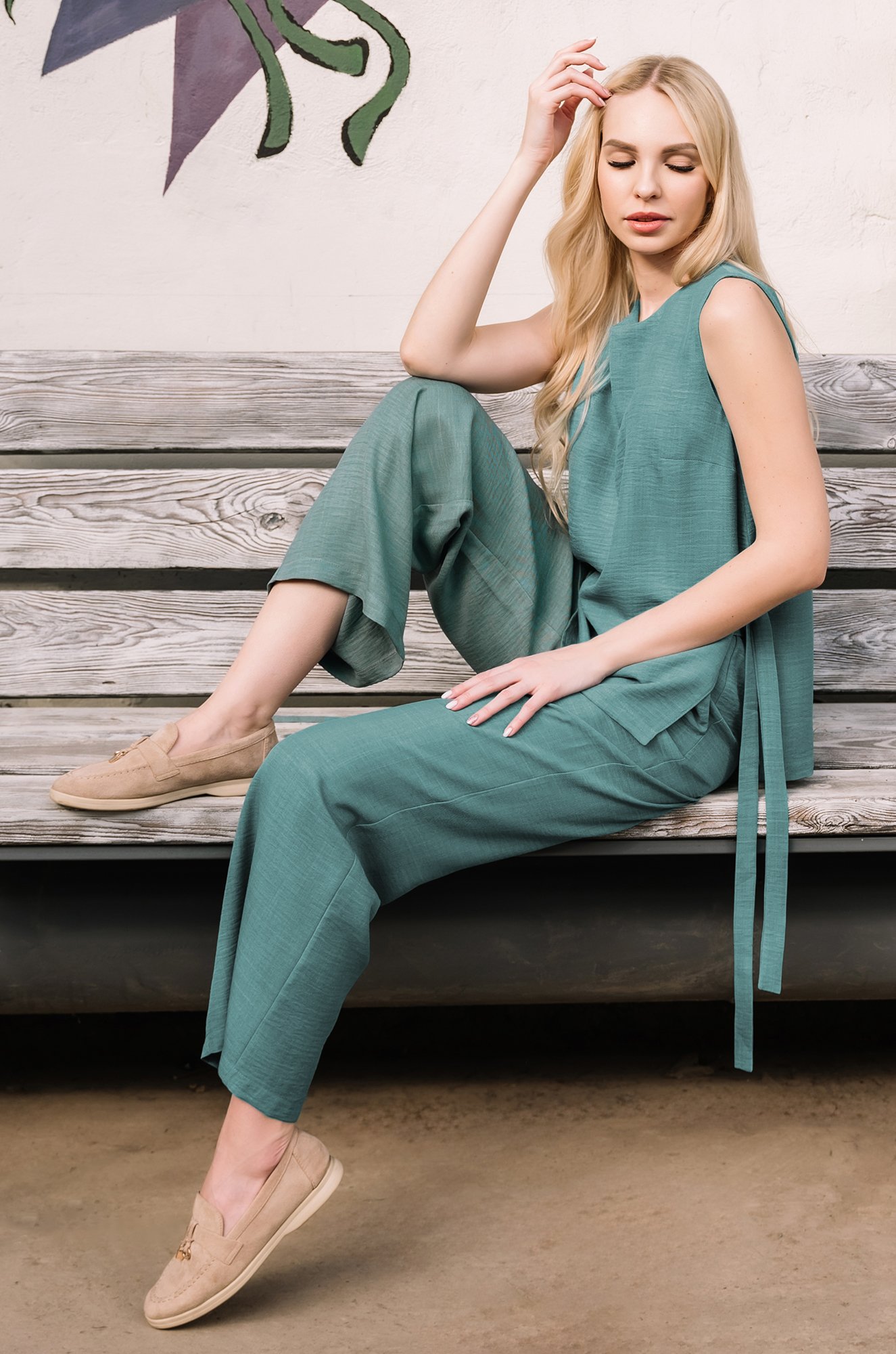 Мятный костюм с штанами можно носить как вместе или сочетать элементы отдельно, создавая новые стильные образы. Костюм для девушек подойдёт для работы, прогулок, отдыха и даже как лёгкий пляжный вариант.