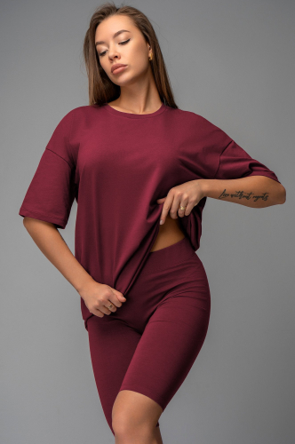 Футболка оверсайз (oversize) с заниженной линией плеча эффектно сочетается с облегающими шортами на широком эластичном поясе. Глубокий цвет бордо придаёт образу элегантность и утончённость. Однотонный костюм для женщин идеально подойдет на каждый день. С ним получатся классные домашние образы и образы в стиле спорт кэжуал (sport casual).