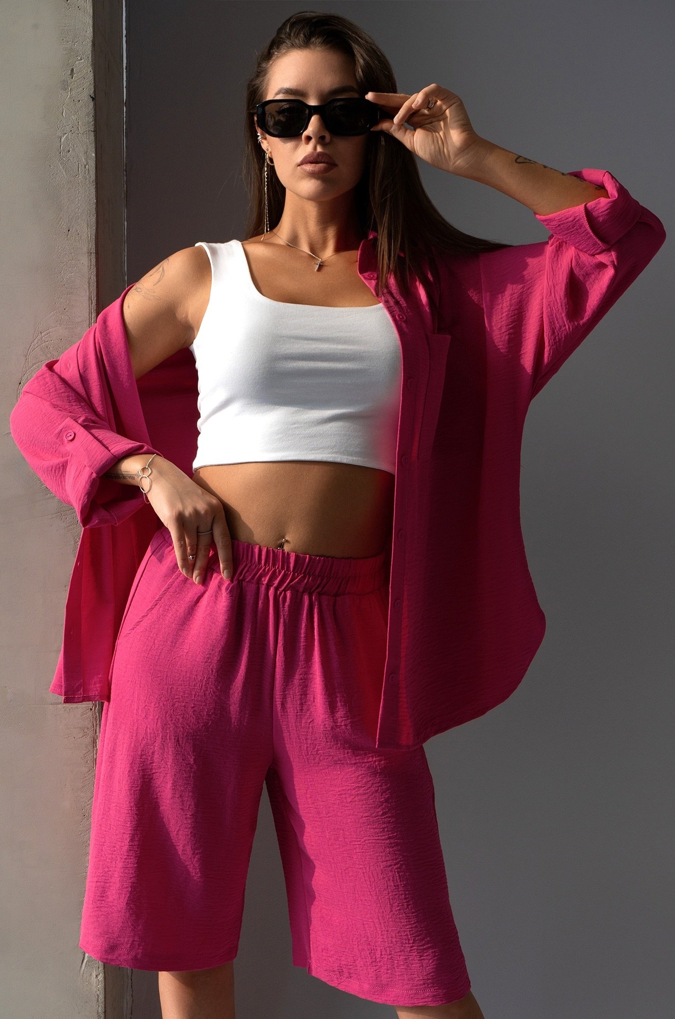 Забудьте про глажку! Костюм оттенка фуксия выполнен из ткани, которая не мнется. Благодаря своим свойствам жатка красиво драпируется на теле, создавая воздушные складки и небрежные линии.